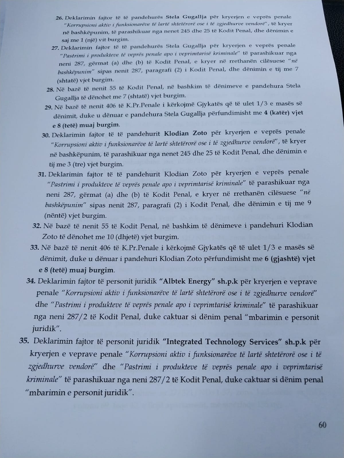 “Për veprimet e mësipërme, të pandehurit Mirel Mërtiri, Stela Gugallja dhe Klodian Zoto janë akuzuar se kanë kryer veprat penale “Korrupsioni aktiv i funksionarëve të lartë shtetërorë ose i të zgjedhurve vendorë”, kryer në bashkëpunim, si dhe “Pastrimi iprodukteve të veprës penale apo i veprimtarisë kriminale” , kryer në bashkëpunim, të parashikuar nga nenet 245 e 25 dhe 287/2 iKodit Penal. Ndërsa, i pandehuri Leftër Koka është akuzuar se ka kryer edhe veprat penale “Korrupsioni pasiv i funksionarëve të lartë shtetërorë ose i të zgjedhurve vendorë”, si dhe “Pastrimi iprodukteve të veprës penale apo i veprimtarisë kriminale” , kryer në bashkëpunim, të parashikuara nga nenet 260 dhe 287/2 të Kodit Penal. Prokuroria e Posaçme kundër Korrupsionit dhe Krimit tëOrganizuar Tiranë ka përfunduar hetimet paraprake për të pandehurit Lefter Koka, Alqi Bllako, Etleva Kondi, Jonida Zeqo, Pëllumb Abeshi, Bardhul Çabiri, Serafin Papa, Mirel Mërtiri, Klodian Zoto, Stela Gugallja, shoqëria “Albtek Energy” sh.p.k, si dhe shoqëria “Integrated Technology Services” sh.p.k dhe ka paraqitur në datë 09.12.2022 në Gjykatën e Posaçme të Shkallës së Parë për Korrupsionin dhe Krimin e Organizuar kërkesën për dërgimin e çështjes në gjyq”, përfundon njoftimi i SPAK.