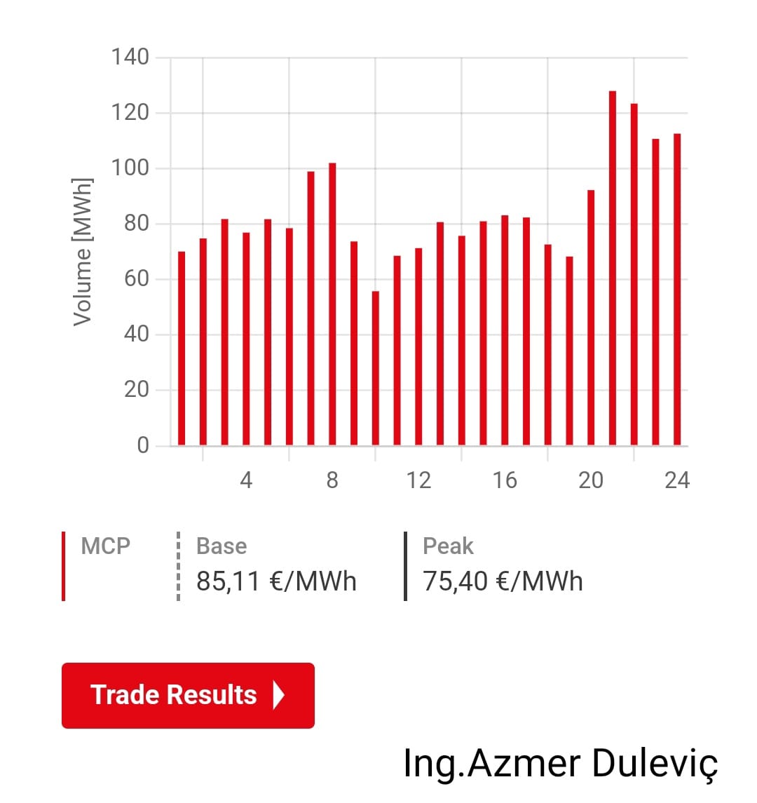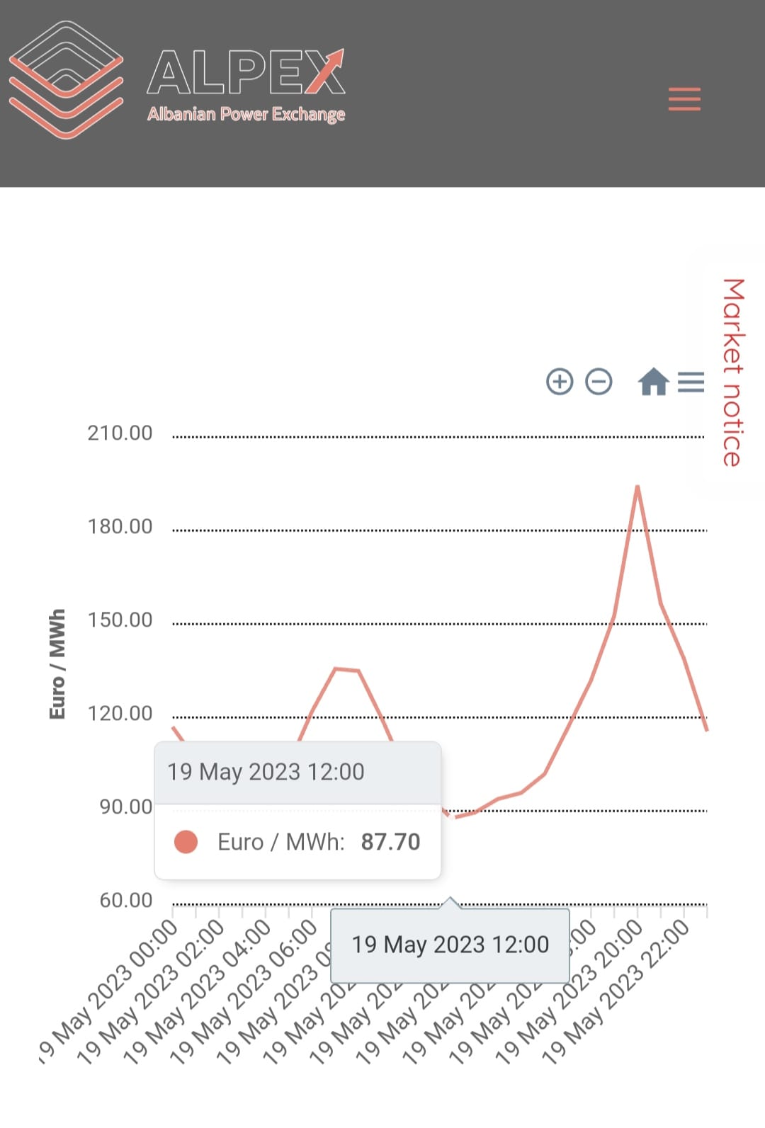 Ndërkohë çmimi më i ulët në Bursën Alpex për datën 19 Maj është 87.7 Euro/Mwh.