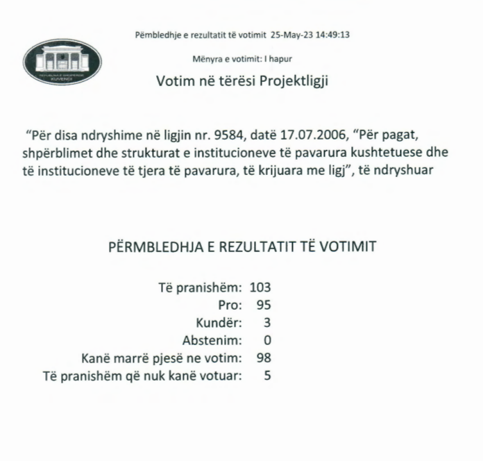 Pavarësisht debateve dhe zërave kundër nga radhët e opozitës, pr/ligji është votuar me shumicë të thjeshtë votash. 95 deputetë votuan pro këtij projektligji, ndërsa 3 kundër. Po ashtu, 5 deputetë refuzuan që të votonin, ndërsa asnjë prej ligjvënësve nuk abstenoi.