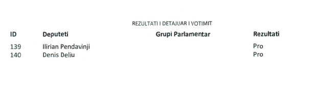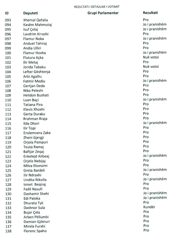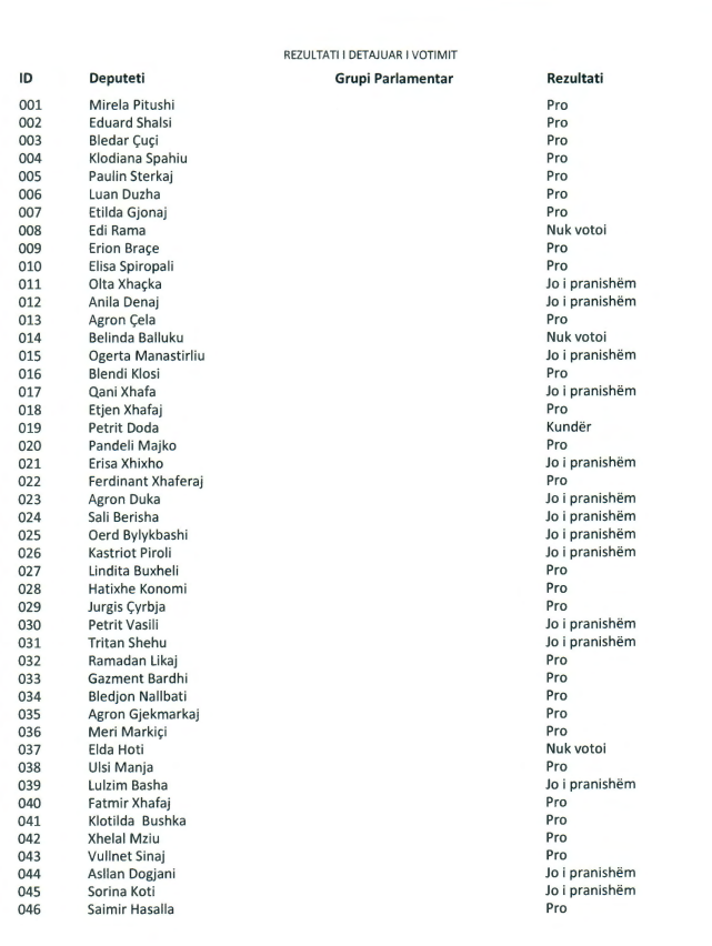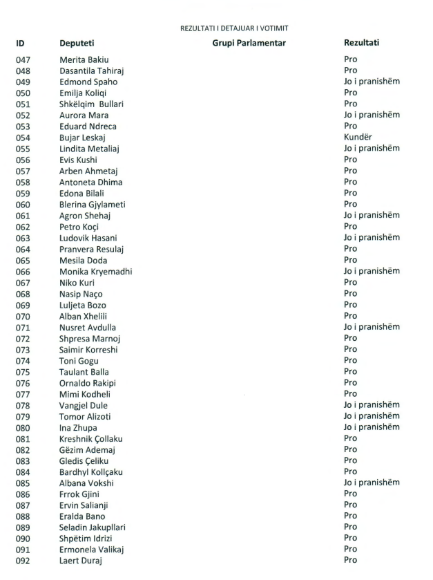 Tre deputetë, Dashnor Sula, Bujar Leskaj dhe Petrit Doda kanë votuar kundër, ndërsa Flutura Açka dhe Elda Hoti kanë qenë në sallë në momentin e votimit, por nuk kanë votuar.