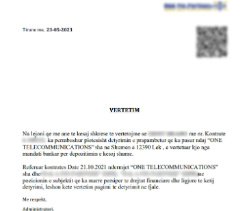 Edhe përse kontrata rezulton se është mbyllur më datë 21.10.2021, qytetari është njoftuar dy vjet më pas se kishte për të paguar një detyrim të majmë. Madje, ONE Albania as që e kishte kontaktuar për të kryer verifikime, por emrin dhe të dhënat e tij ia ka përcjell një kompanie përmbarimore.