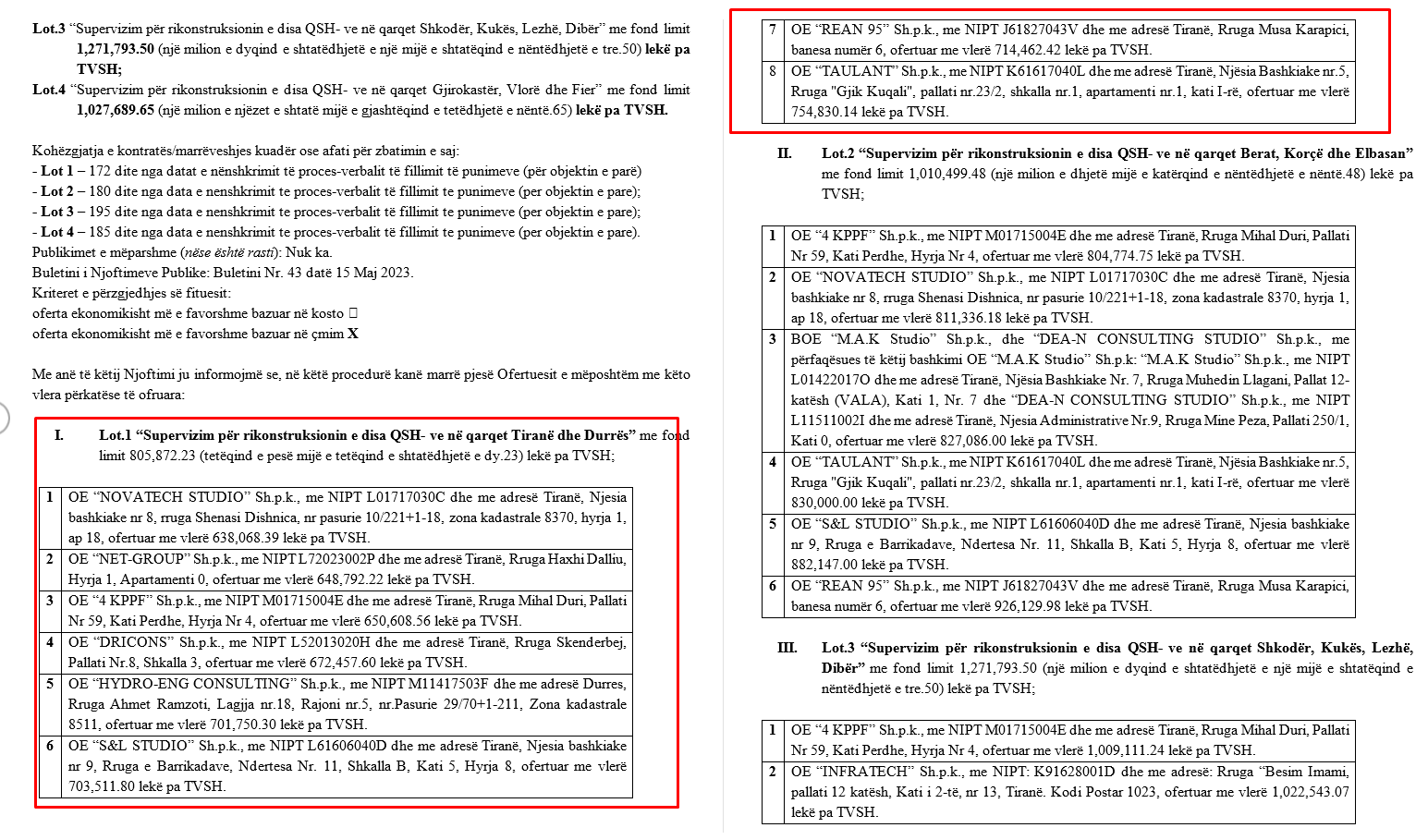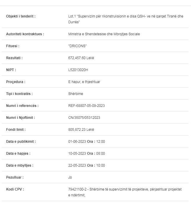 Tenderi në fjalë – me objekt “Lot 1 “Supervizim për rikonstruksionin e disa Qendrave Shëndetësore në qarqet Tiranë e Durrës” dhe fond limit rreth 8 mln Lekë të vjetra (805,872.23 Lekë) është çelur më 10 Maj dhe fituesi është shpallur 12 ditë më pas.