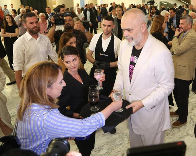 Në foto shihet Rama ma tabaka në dorë bën muhabet me gazetaret teksa u shërben nga një gotë verë.