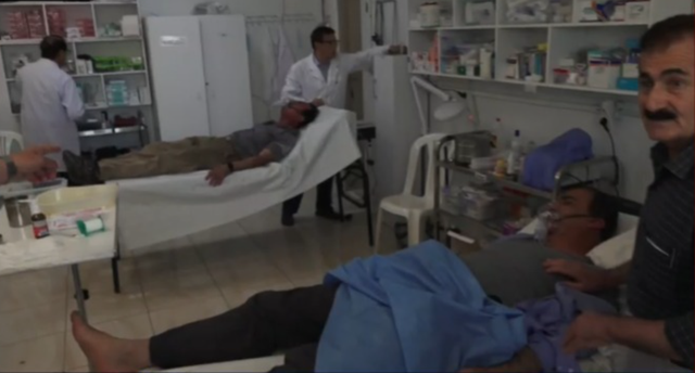 Brenda ambienteve të spitalit, i cili ndodhet në kampin e MEK, shihen disa persona të plagosur dhe e pranishme është edhe ambulanca.