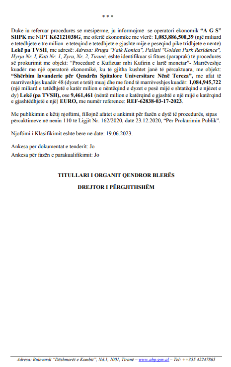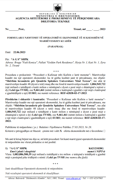 Dokumenti i mësipërm është publikuar në datën 22 qershor 2023 në Agjencinë e Prokurimit Publik. Është shpallja e fituesit të tenderit me objekt “shërbim lavanderie për Qendrën Spitalore Universitare Nënë Tereza”, me afat të  marrëveshjes kuadër 48 (dyzet e tetë) muaj dhe me fond të marrëveshjes kuadër 1,084,945,722  lekë pa TVSH.
