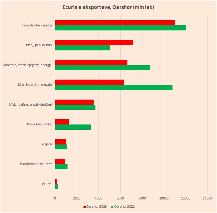 Mineralet e lëndët djegëse, tekstilet e këpucët si dhe materialet e ndërtimit e metalet kanë ndikuar në këtë rënie në qershor, ndërsa me nivele më të ulëta janë tkurrur makineritë e pajisjet. I vetmi grup që ka shënuar rritje, duke amortizuar disi rënien e më të mëdhenjve është ai i ushqimeve, pijeve e duhanit. Madje, në qershor, ky i fundit ka kaluar për herë të parë në historinë e eksporteve në të dytin më të madh në vend, pas tekstileve e këpucëve.