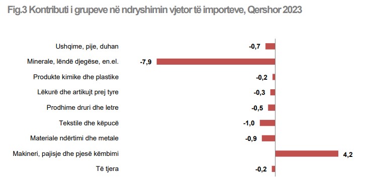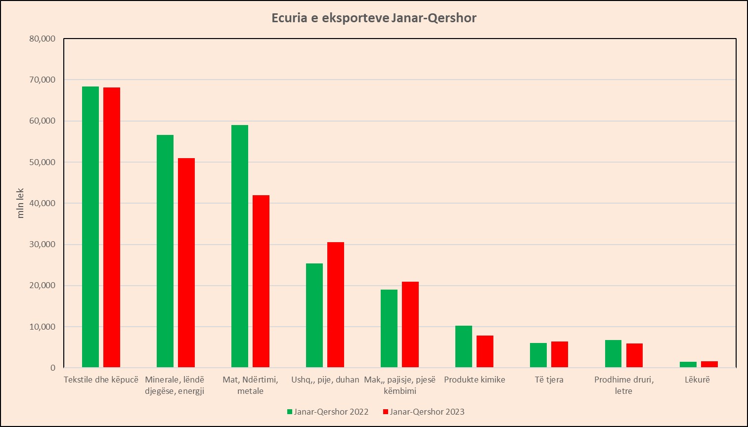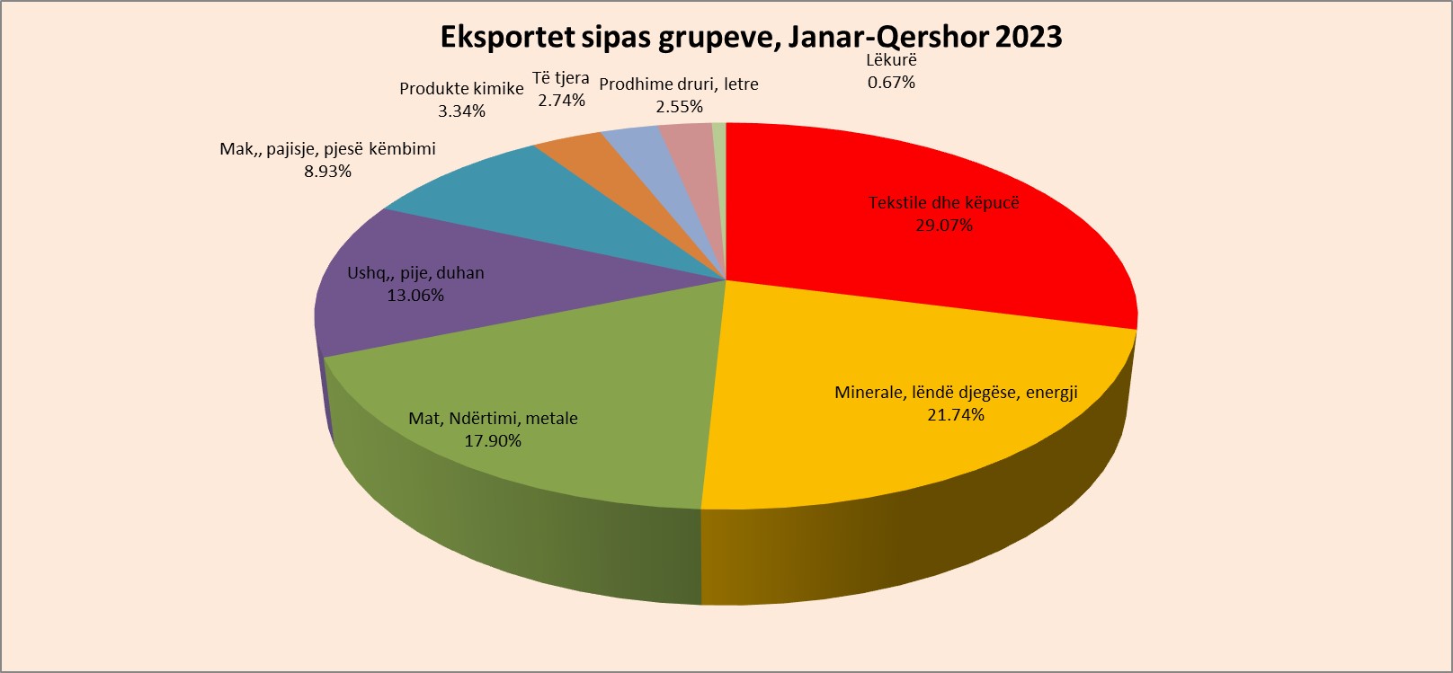 Sipas INSTAT, Gjatë muajit Qershor 2023, në uljen e eksporteve prej -17,3%, kanë ndikuar grupet: “Materiale ndërtimi dhe metale” me -9,7 pikë përqindje, “Minerale, lëndë djegëse, energji elektrike” me -4,5 pikë përqindje, “Produkte kimike dhe plastike” me -4,4 pikë përqindje, etj. Ndërsa, pozitivisht ka ndikuar grupi: “Ushqime, pije, duhan” me +4,6 pikë përqindje.