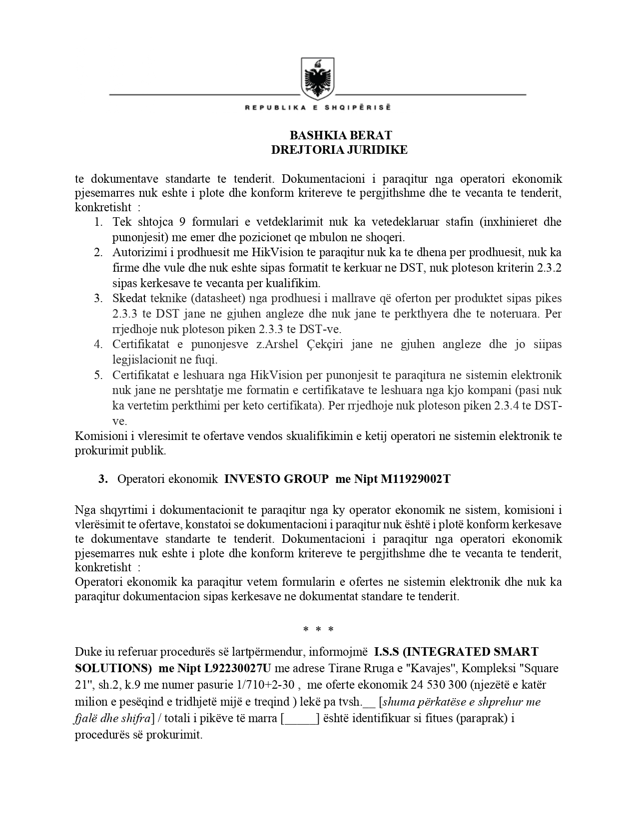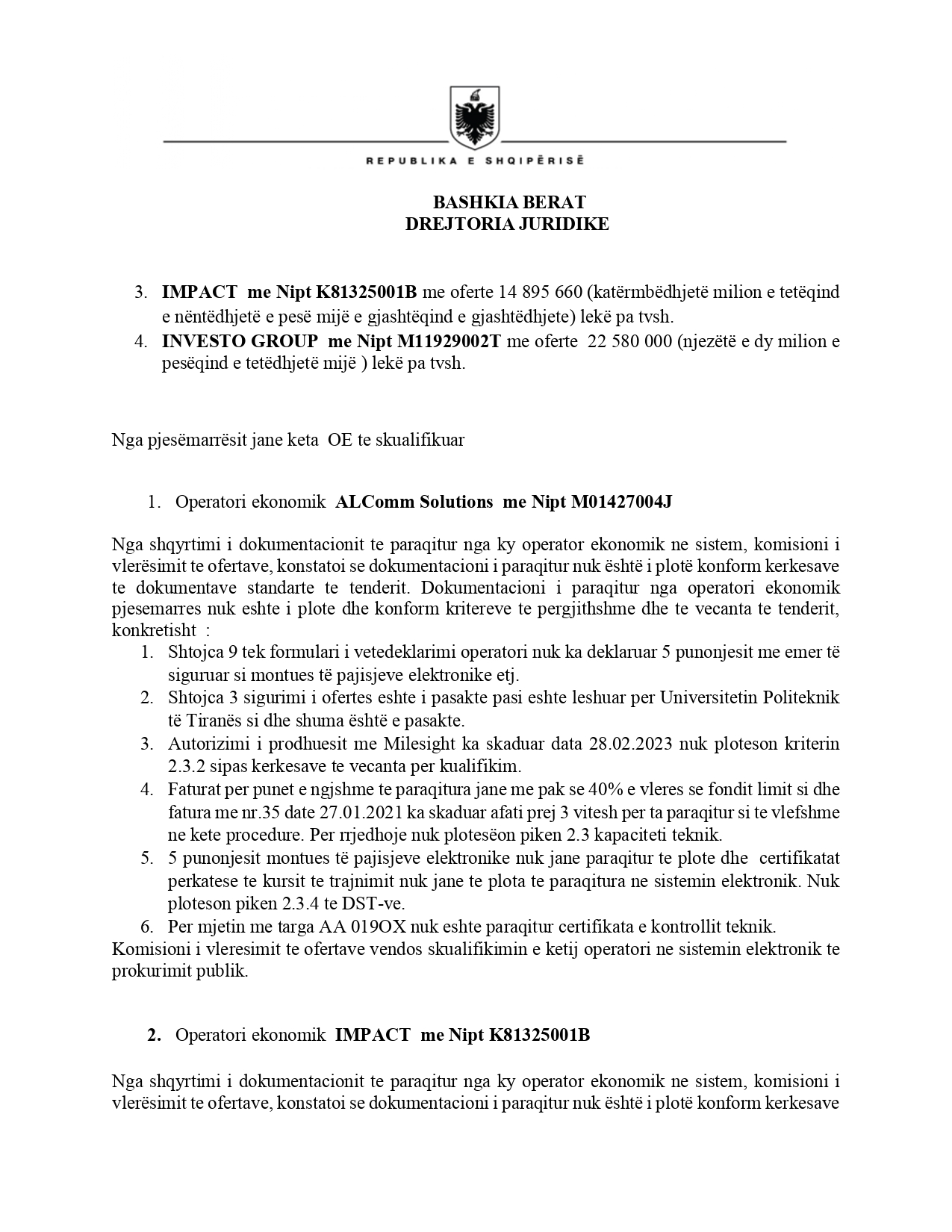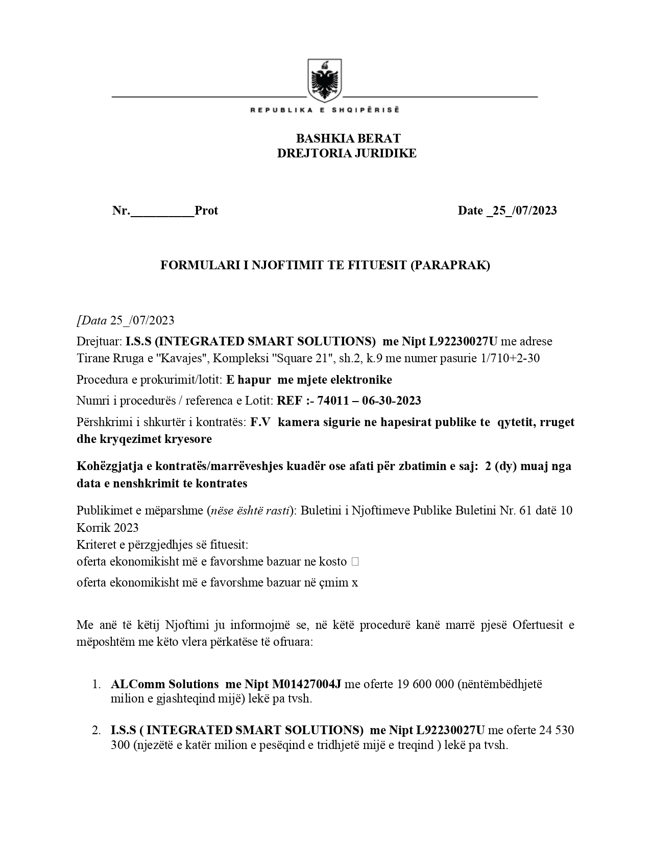 Sipas dokumenteve që disponon BoldNews.al, në datën 25 korrik 2023, është shpallur fituesi i procedurës “F.V kamera sigurie në hapësirat publike të qytetit, rrugët dhe kryqëzimet kryesore”. Pra, nuk bëhet fjalë për institucionë të rëndësishme, por për rrugë dhe kryqëzime. Kamerat duhet të instalohen brenda 2 muajsh, ndërsa kriter fitues ishte oferta ekonomikisht më e favorshme, bazuar në çmim. “Me anë të këtij njoftimi ju informojmë se, në këtë procedurë kanë marrë pjesë ‘ALComm Solutions’ me ofertë 19.600.000 lekë. I.S.S ( INTEGRATED SMART SOLUTIONS) me ofertë 24.530.300 lekë, IMPACT me ofertë 14.895.660 lekë dhe ‘INVESTO GROUP’ me ofertë 22.580.000 lekë” thuhet në këtë dokument. Pra, oferta më e lartë ishte e firës I.S.S, me një diferencë prej 100 mijë eurosh nga më e ulëta. Por, këtu filloi edhe skema e famshme e institucioneve shtetërore, ku të gjitha skualifikohen dhe fiton ajo e paracaktuara.