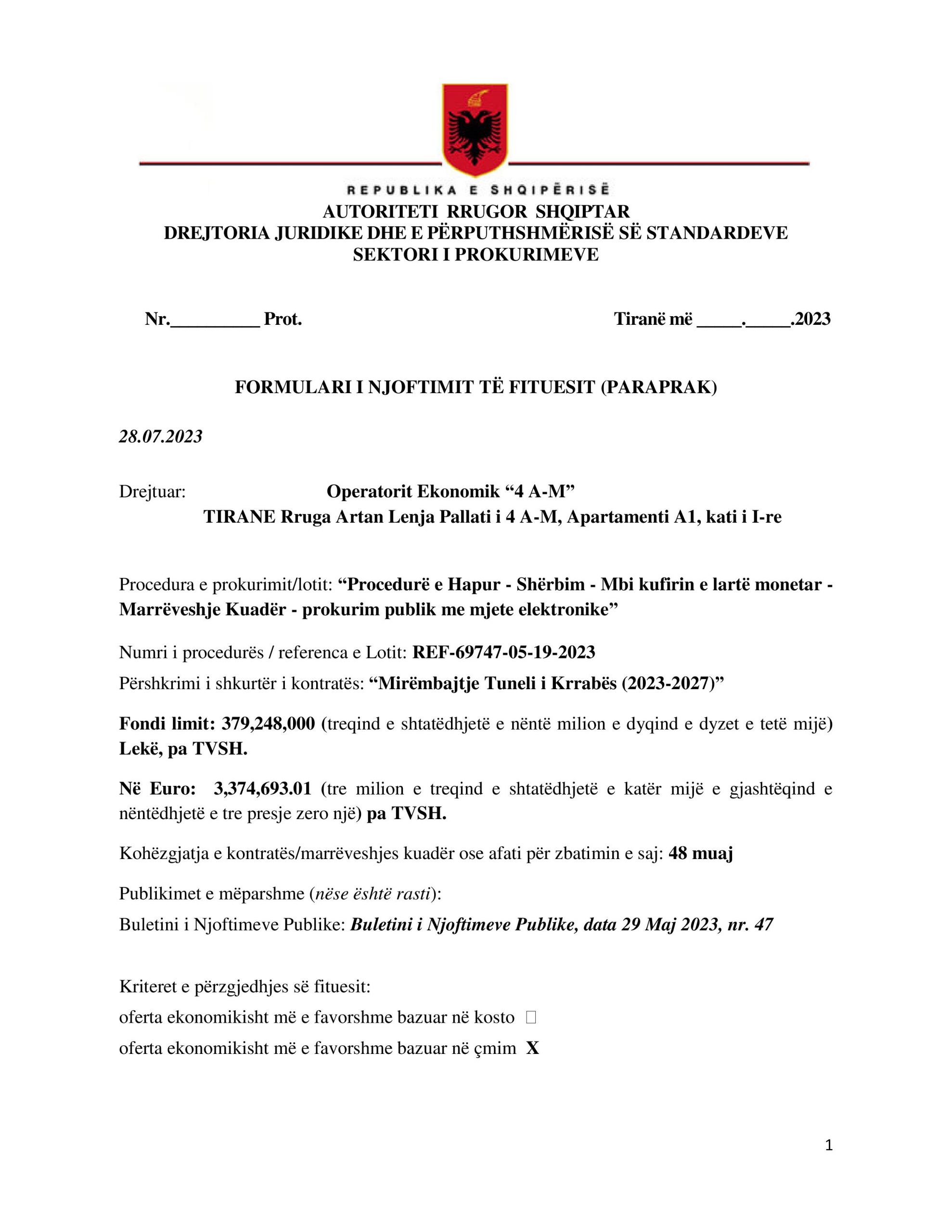 Në datën 28 korrik 2023, ARRSH-ja shpalli njoftimin e mësipërm, fituesin e tenderit të mirëmbajtjes së tunelit të Krrabës. Bëhet fjalë për kontratën “mirëmbajtje tuneli i Krrabës (2023-2027)”. Fondi limit i kësaj procedure ishte 379.248.000 lekë pa TVSH, ose me TVSH rreth 4 milionë euro. Por, llogaritë e ARRSH-së janë se 379 milionë lekë të rinj bëjnë 3.3 milionë euro, duke vendosur një kurs këmbimi të disa muajve më parë dhe jo këtë ta tanishmin. Në këtë procedurë bën ofertë “SALILLARI” me vlerë 339.375.000 lekë pa TVSH, “4 A-M” me vlerë 378.228.000 lekë pa TVSH. Kjo ofertë ishte edhe fituesi, i cili ofroi 99 % të fondit limit. Ndërkohë, në tender mori pjesë edhe “peshkaqeni” tjetër i fondeve publike “ALKO IMPEX CONSTRUCTION” me vlerë 333.720.000 lekë.