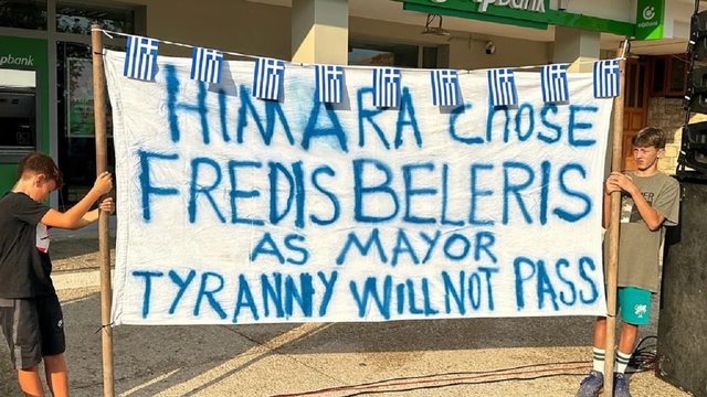 Sakaq, qytetarët që brohorasin thirrje për drejtësi kanë në duar pankarta të shkruara në greqisht, duke kërkuar lirimin e kryetarit që kanë votuar më 14 Maj. Një prej tyre që foli për mediat është shprehur se po zhvillojnë një protestë paqësore dhe kërkojnë që të lirohet Fredi Beleri pasi sipas tyre u zgjodh nga vetë qytetarët.