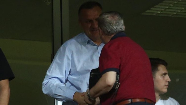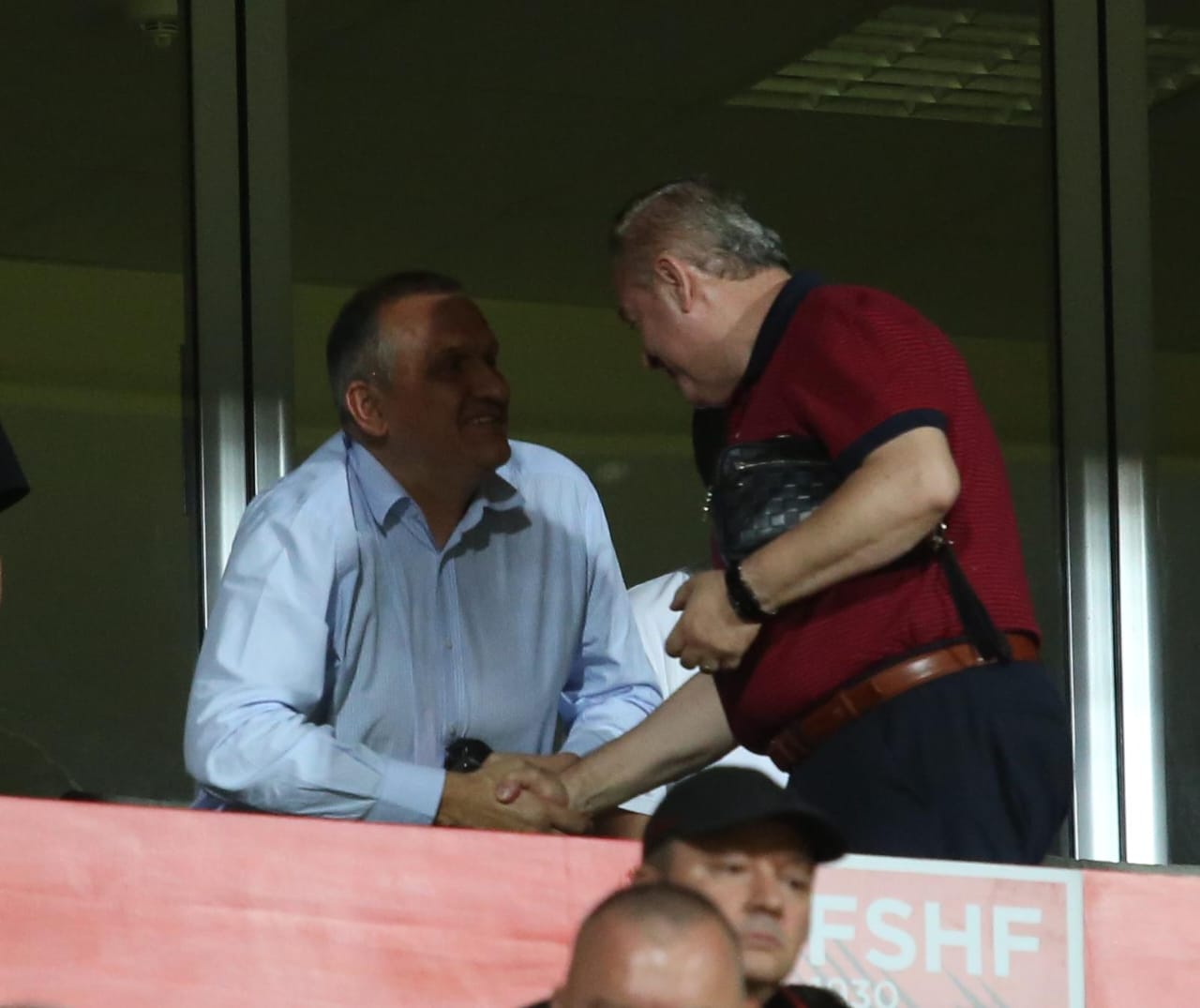 FOTO/ Nën hetim nga SPAK, Ilir Beqaj ndjek Partizanin në stadium, shtrëngon duart me ish-deputetin e PD