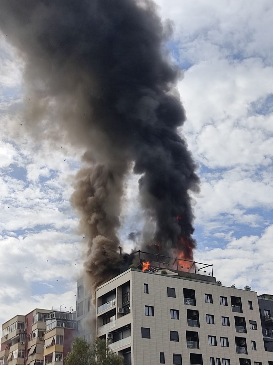 Një zjarr i madh ka rënë këtë të enjte në Tiranë. Flakët kanë përfshirë katin e fundit të një pallati, në rrugën “Sali Butka”, në zonën ku ndodhen zyrat e DPSHTRR-së.
