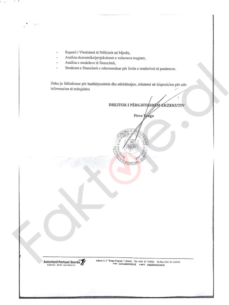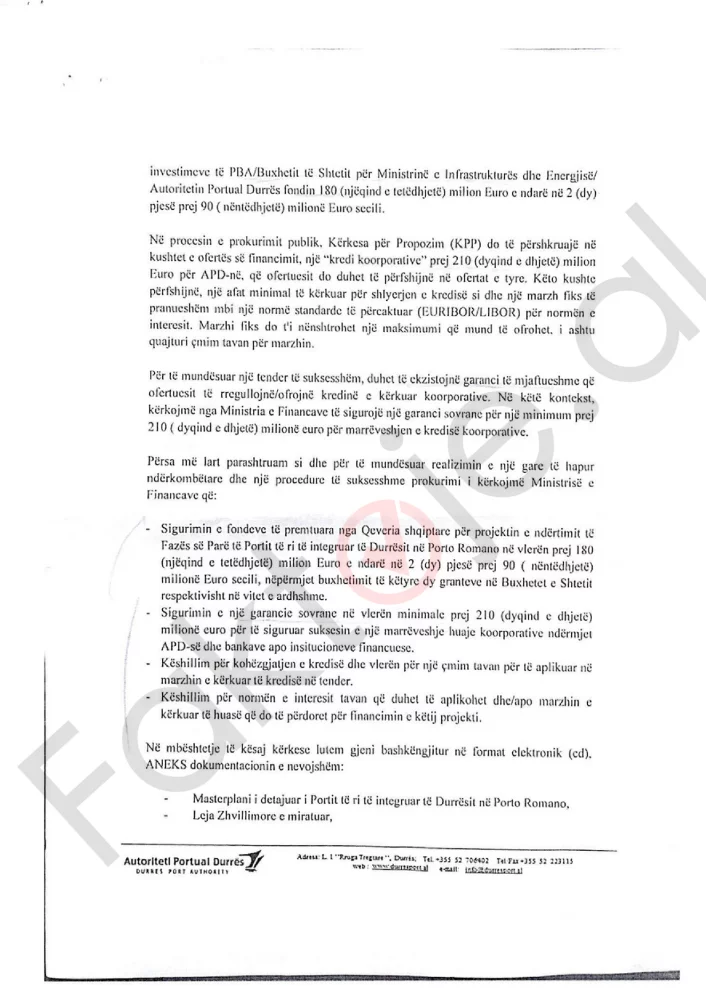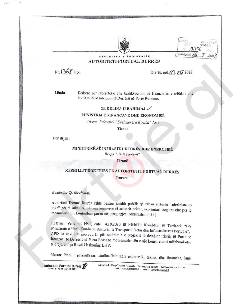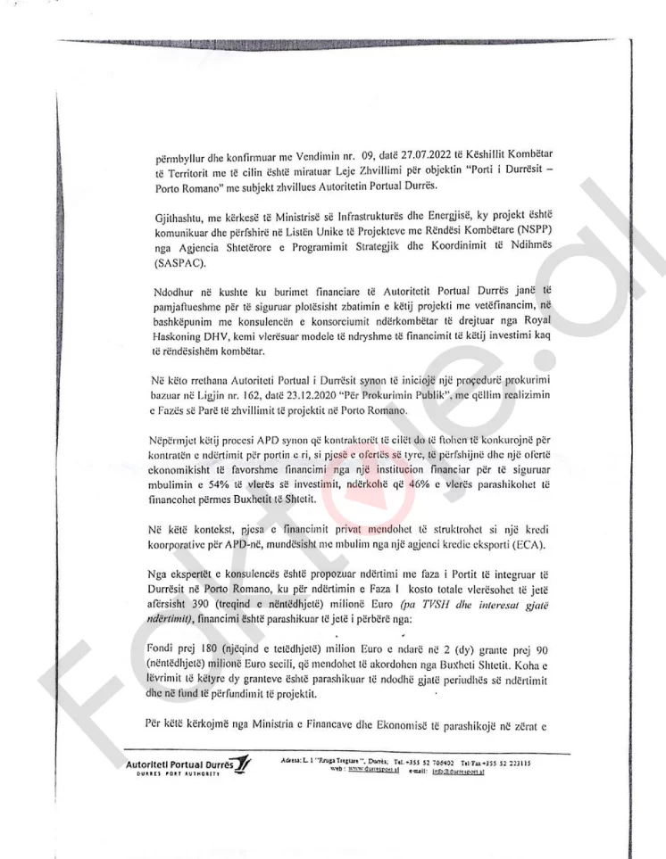 “Ndodhur në kushte ku burimet financiare të Autoriteti Portual Durrës janë të pamjaftueshme për të siguruar plotësisht zbatimin e këtij projekti me vetëfinancim, në bashkëpunim me konsulencën e kosorciumit ndërkombëtar të drejtuar nga Royal Haskoning DHV, kemi vlerësuar modele të ndryshme të financimit të këtij investimi kaq të rëndësishëm kombëtar.”- shkruhet në një shkresë zyrtare që Autoriteti Portual i Durrësit i ka drejtuar Ministrisë së Financave më 10 maj 2023.
