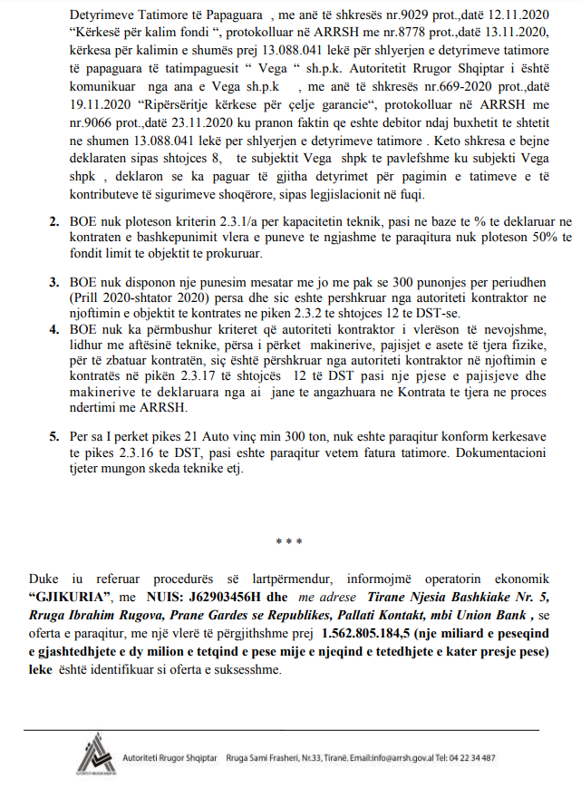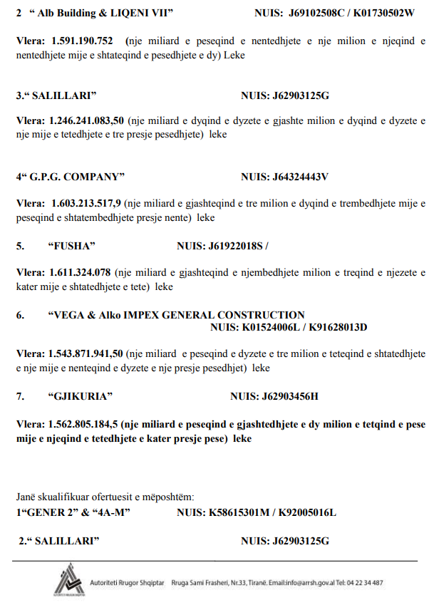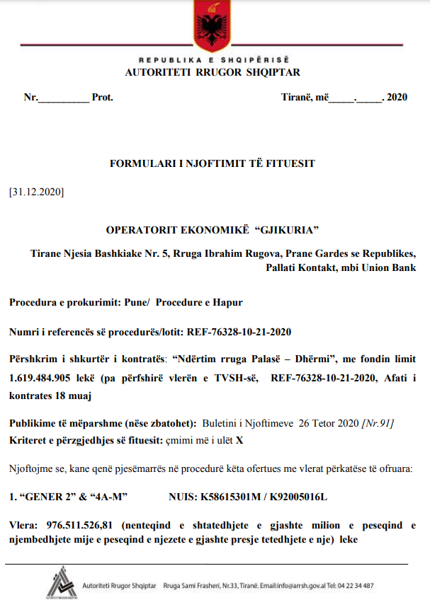 Tenderi i vitit 2020 u fitua nga “Gjikuria”, teksa fituesi kishte një ofertë prej 5 milionë eurosh më shumë sesa oferta më e vogël