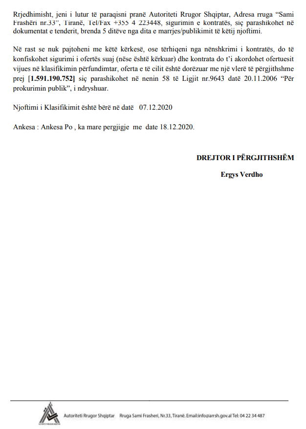 Dokumenti i mësipërm është hapja e procedurës tenderuese për “ndërtim rruge Palasë-Dhërmi”. Siç lexohet, bëhet fjalë për një procedure të hapur nga Autoriteti Rrugor Shqiptar, me një fond prej 311.884.255 lekë, teksa paratë do t’i jepen afrofe firmës “Gjikuria”.