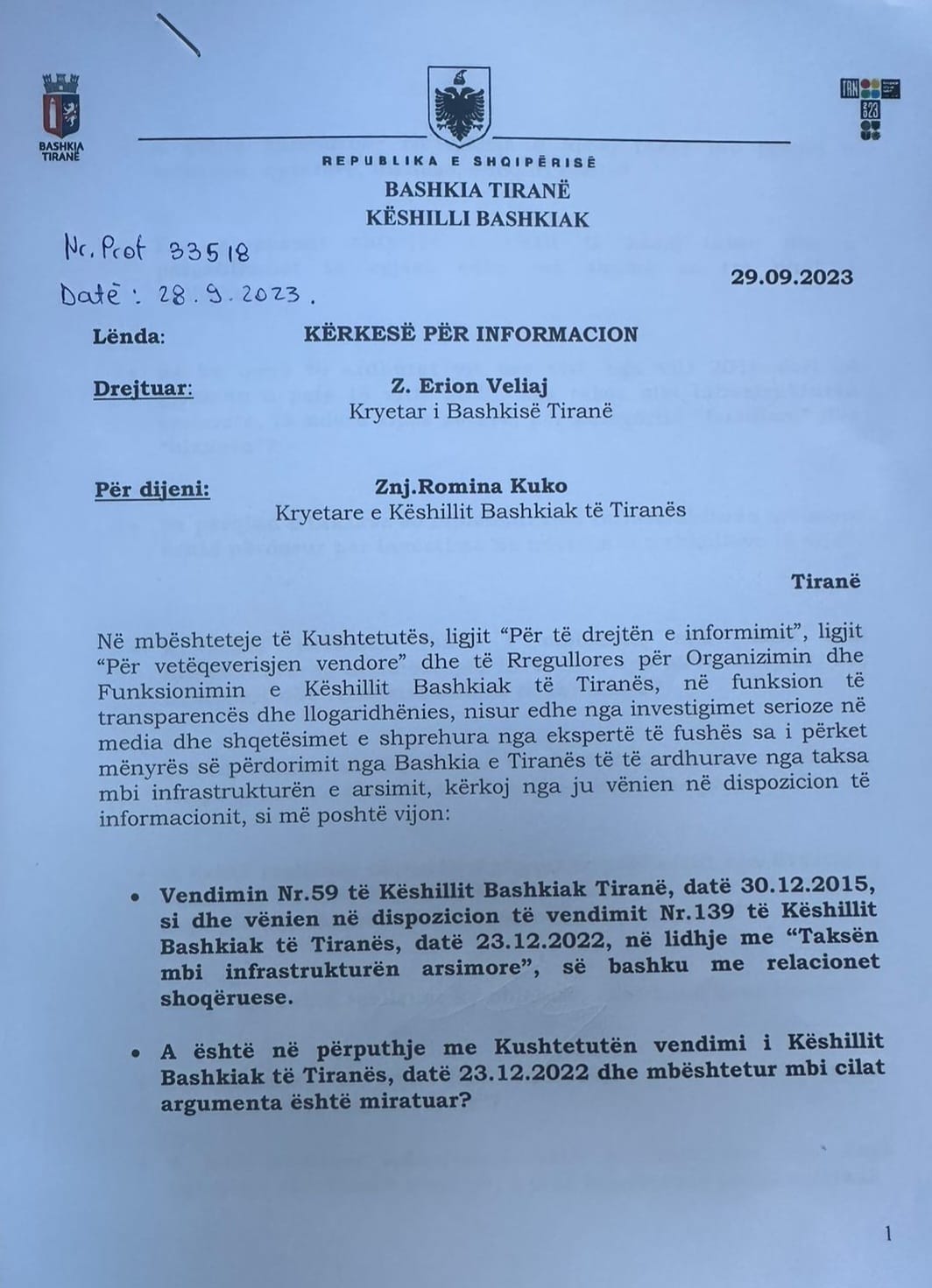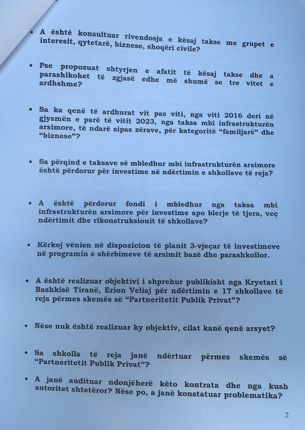 Këto janë 16 pyetjet të cilat i kam adresuar zyrtarisht për Kryetarin e Bashkisë së Tiranës dhe të cilat presin përgjigje nga të gjithë qytetarët dhe bizneset e kryeqytetit.