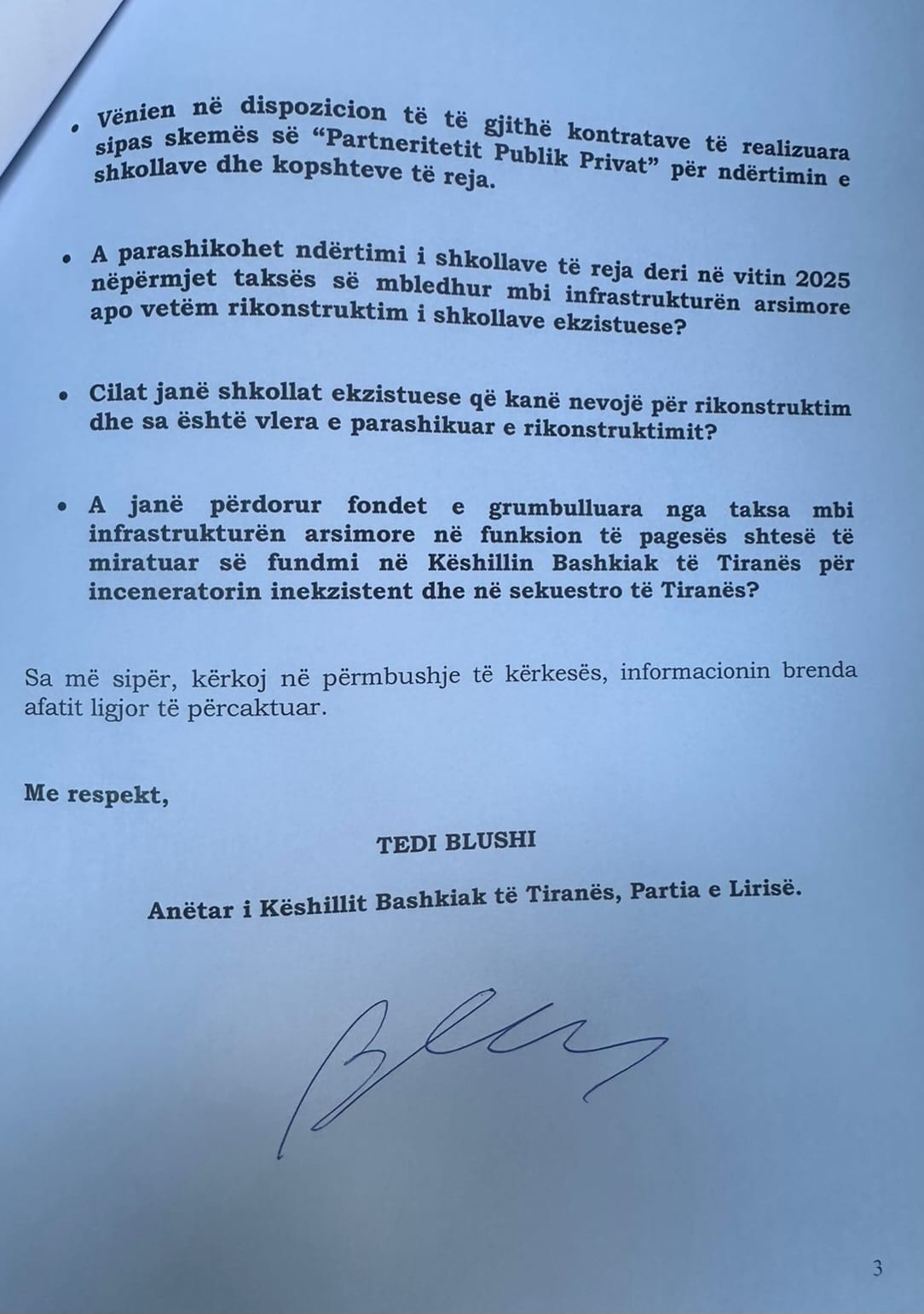 Si anëtar i Këshillit bashkiak, Blushi thotë se ka nisur 16 pyetje, ndër të cilat renditet edhe ajo se “sa shkolla të reja janë ndërtuar përmes skemës së “Partneritetit Publik Privat?”