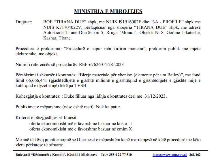 Tenderin me objekt “Blerje materiale për xhenion (elemente për ura Bailey)”, është publikuar më datë 3 korrik në sistemin e Agjencisë së Prokurimeve Publike. Sikurse shihet në dokumentet, me fondin në fjalë po blihen materiale për të ndërtuar ura metalike, konkretisht: shufra, kaçavida, gozhdë e të tjera, ndërsa është planifikuar që të shpenzohen 666 milionë lekë.