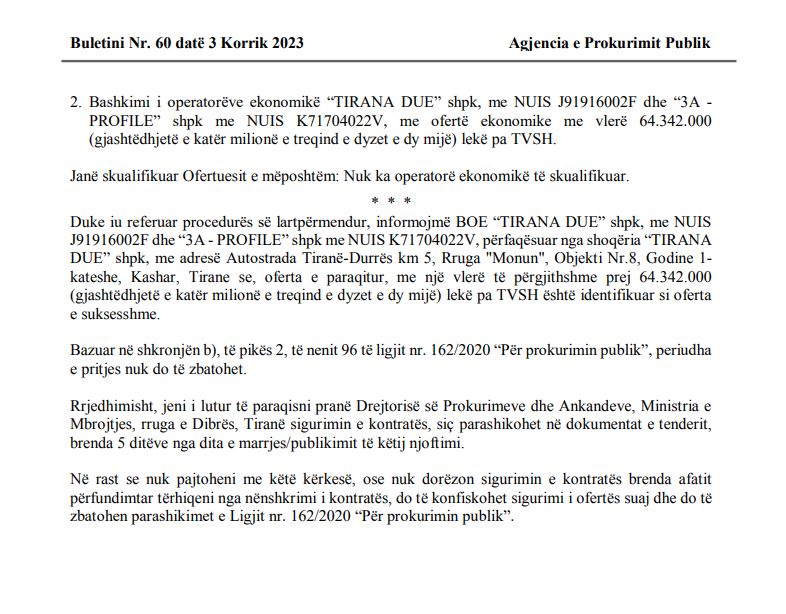 Siç sqarohet në dokumentet zyrtare, ofertë për këtë tender kanë paraqitur vetëm bashkimi i operatorëve “TIRANA DUE shpk” dhe “3A – PROFILE” shpk. Oferta e tyre ishte në nivelet e 64.342 milionë lekë, pra sa gati 90% e fondit limit.