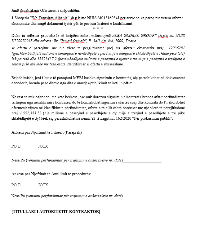 Dokumenti i mësipërm është njoftimi i fituesit të tenderit me objekt “përkthim i legjislacionit të Bashkimit Evropian”. Fondi i akorduar, është 13,128,666 lekë pa TVSH, teksa kohëzgjatja e kontratës ose marrëveshjes kuadër për zbatimin e saj është 1 vit marrëveshja kuadër, 45 ditë kontratat e lidhura në bazë të saj. Në dokumente shoqëruese thuhet se kërkohet “përkthim i legjislacionit të BE anglisht-shqip” dhe “përkthim i legjislacionit të BE shqip-anglisht”.