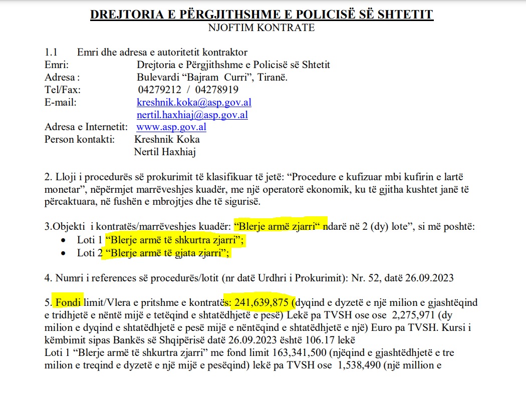 Gjithsesi, në dokumente parashikohet se do të bëhet tenderi “blerje armë zjarri” i ndarë në 2 lote”, “blerje armë të shkurtra zjarri” dhe loti 2 “blerje armë të gjata zjarri”. Vlera e pritshme e kontratës është 241.639.875 lekë pa TVSH. Firmat duhet të paraqesin ofertë deri në datën 8 nëntor 2023.