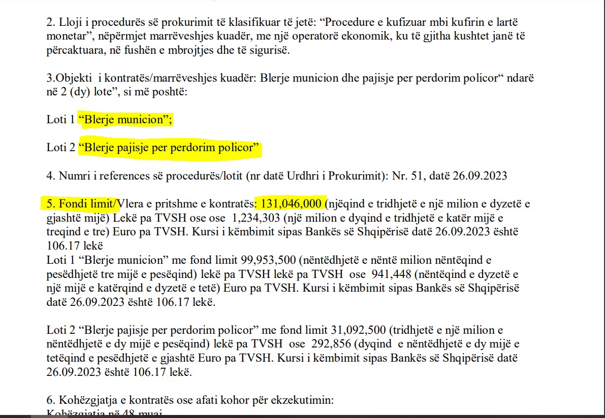 Ndërkohë, i njëjti institucion prokurues ka hapur edhe tenderin me objekt “blerje municion dhe pajisje për përdorim policor”. Loti i parë “blerje municion” dhe i dyti “blerje pajisje për përdorim policor”. Fondi për të dyja lotet është 131,046,000 lekë.