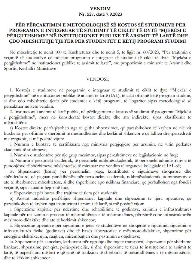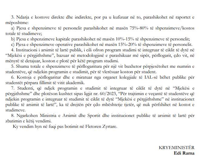 Ndërkohë, shtoi, në relacionin e përgatitur në Parlamentin e Shqipërisë citohet se “Sipas informacionit të përcjellë nga Universiteti i Mjekësisë, Tiranë, kostoja e studimit për programin e integruar të studimit në “Mjekësi e Përgjithshme” është 678.994 lekë/vit”.