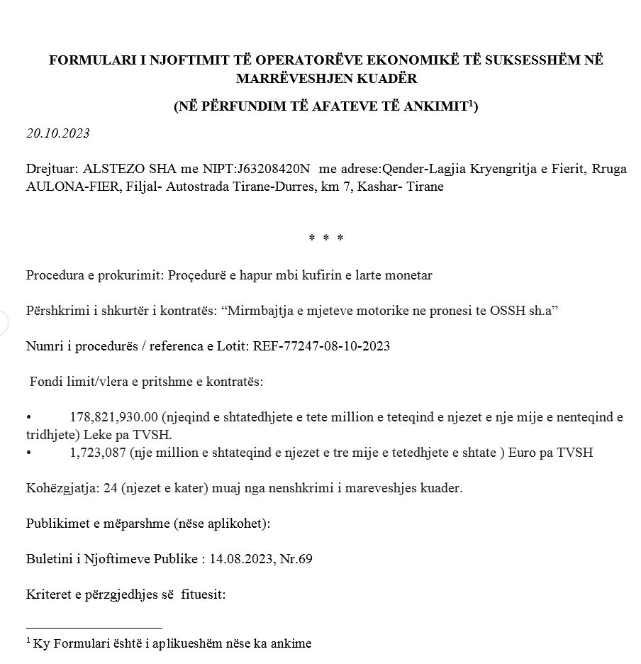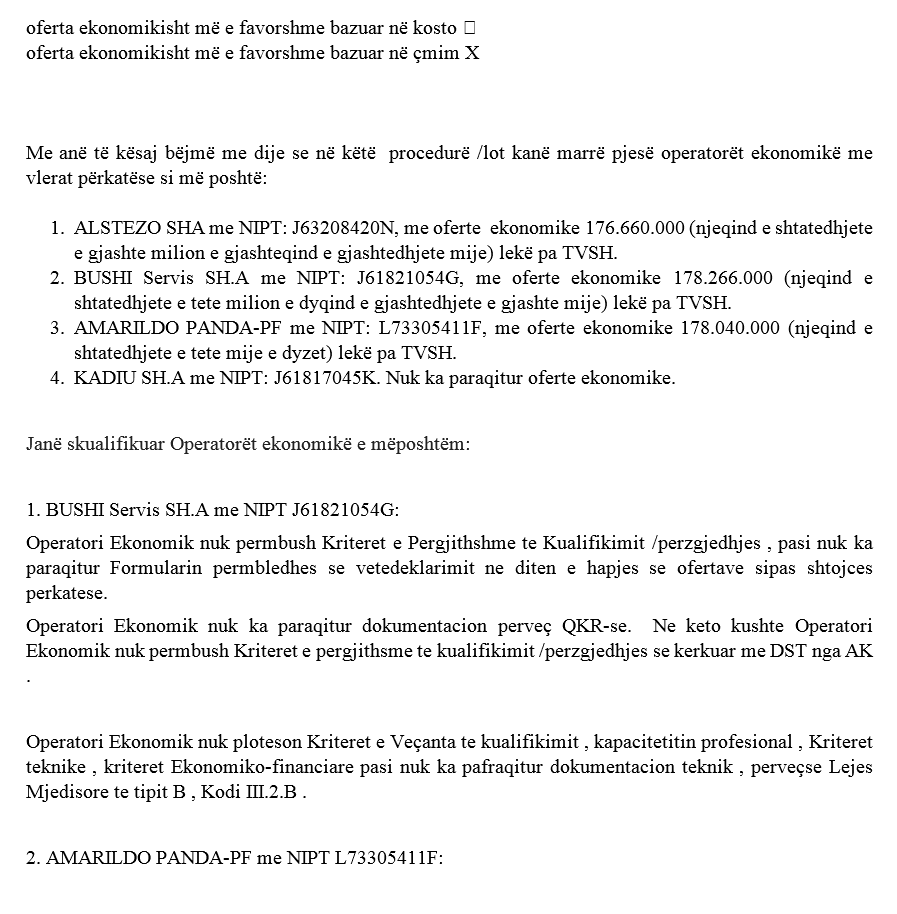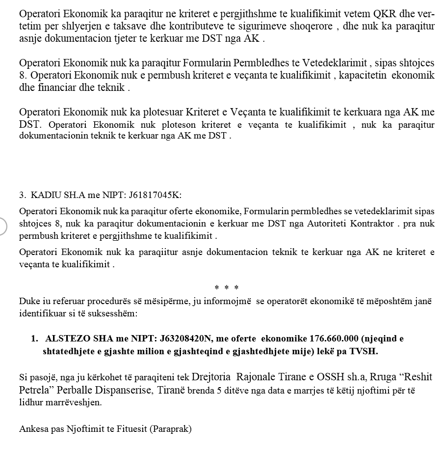 Në dokument shkruhet se kohëzgjatja e mirëmbajtjes është 24 muaj, aq sa janë në fuqi edhe kontratat e qirasë. Në tender kanë marrë pjesë disa shoqëri, ku fitues ka dalë firma “ALSTEZO” me ofertë ekonomike 176.660.000 lekë pa TVSH. Tre firmat e tjera në garë janë s’kualifikuar, e para për arsye se nuk plotëson kriterin profesional, e dyta s’kishte paraqitur formular për taksat dhe e treta “nuk ka paraqitur ofertë ekonomike”. Dyshime të mëdha se gjithçka ka qenë formale dhe me fitues të paracaktuar.