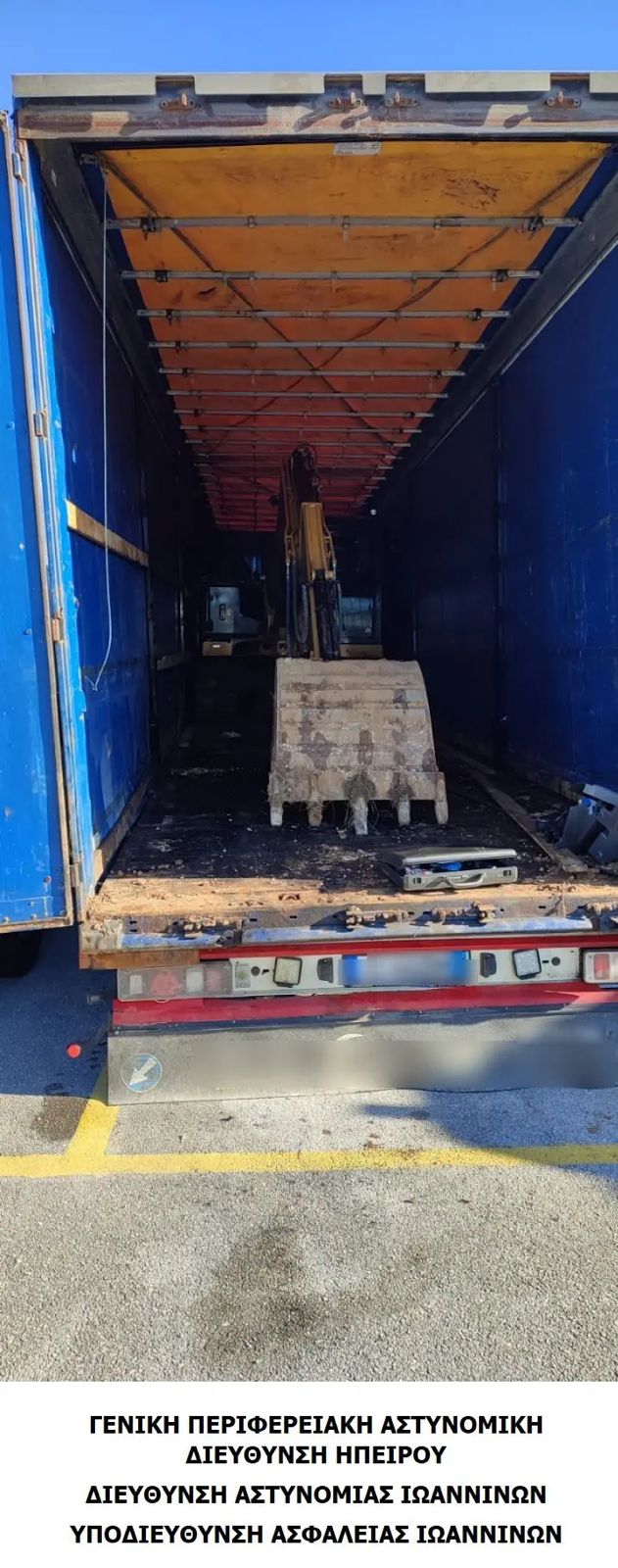 2. Vjedhja e një makinerie tokësore, me vlerë 100.000 euro, e ndodhur në orët e para të datës 23.11.2023 në zonën e Janinës, e cila u zbulua më datë 26.11.2023 në zonën e Igumenicës i ngarkuar në një rimorkio me shtrat të sheshtë dhe i’u dorëzua pronarit.