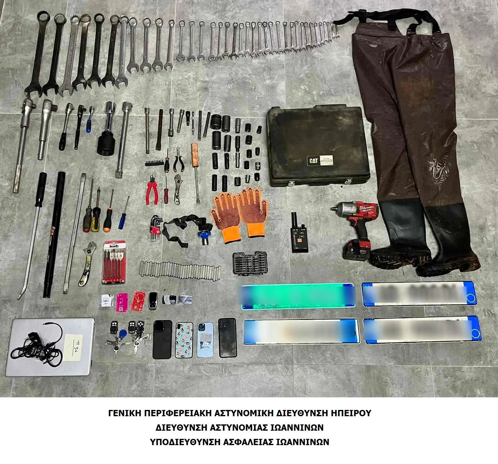 Në kuadër të hetimeve ndër të tjera u sekuestruan kamioni si dhe dy rimorkiot, të përdorura në secilin prej rasteve të vjedhjes në Janinë dhe Ftiotidha, 2 makina të cilat janë përdorur si pararendës në vjedhjet e mësipërme, 4 celularë, Gjurmues GPS dhe kamera, veshje pune dhe doreza dhe