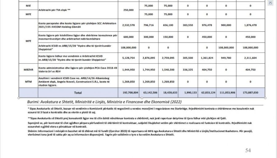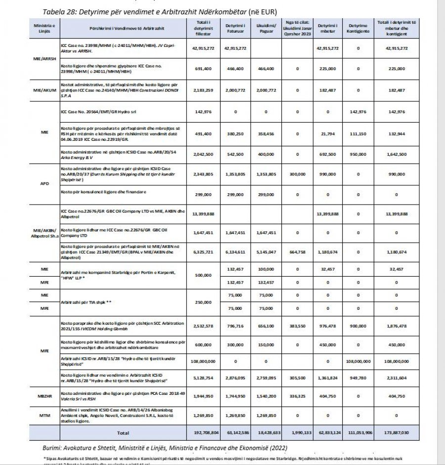 Aktualisht shtetit shqipar mbart detyrimin për kostot e përfaqësimit ligjor në vlerën 1.2 milion euro. Deri tani shteti shqiptar njeh detyrimin fillestar prej 197.2 milion euro lidhur me arbitrazhet. Ndërkohë vijojnë pagesat e studiove ligjore lidhur me procedurat e Arbitrazhit. Vetëm për vitin 2023 janë paguar 2.8 milion euro për studiot e huaja të kontraktuara nga shteti shqiptar lidhur me arbitrazhet. Dhe gjysma e kësaj vlere shkon për Omnia Strategy, kompania e bashkëshortes së Tony Blair.