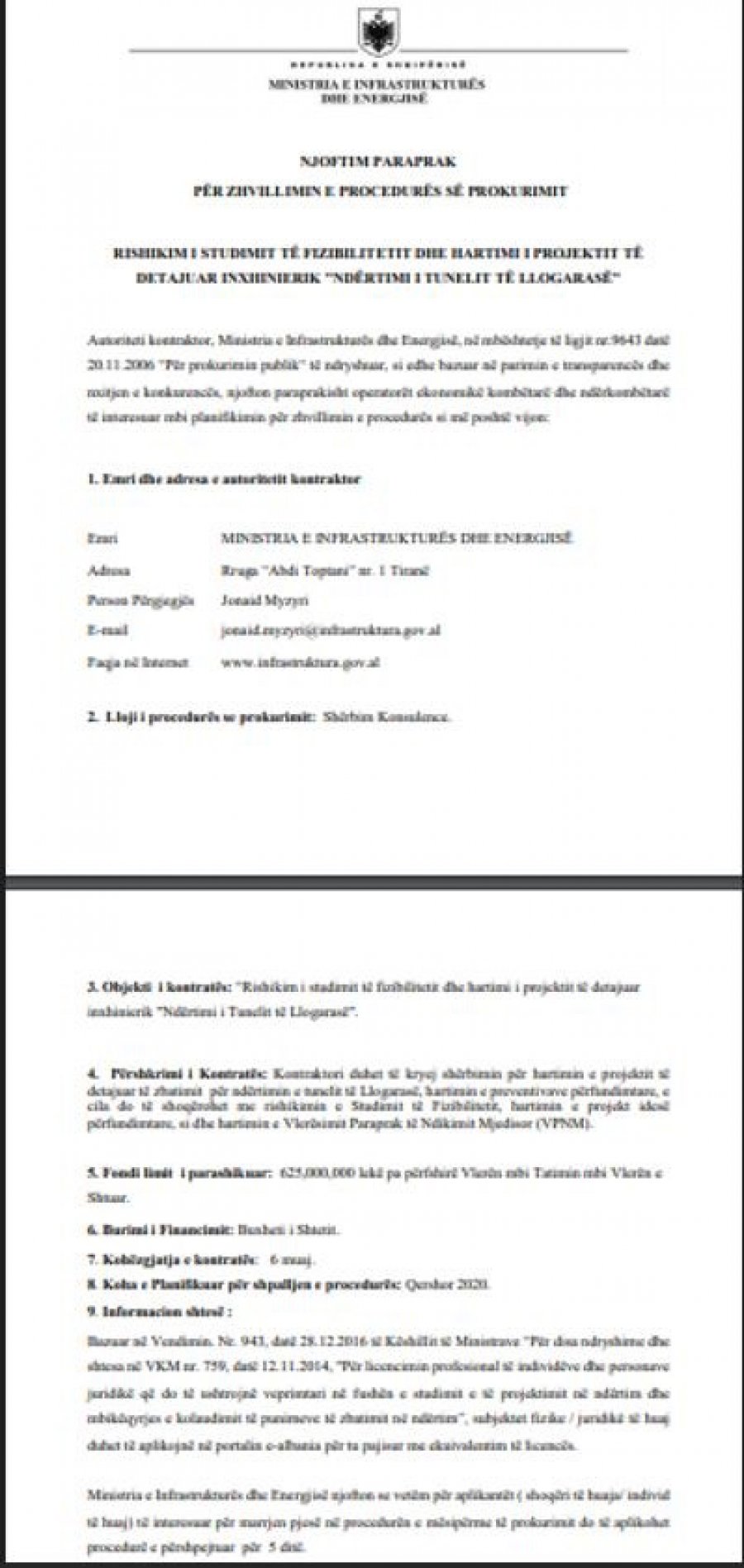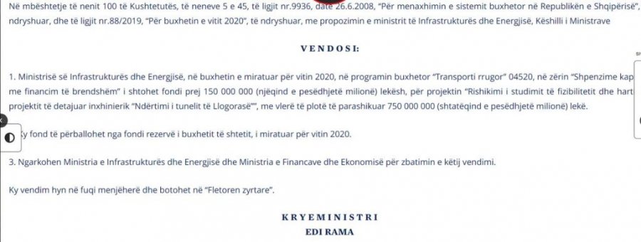 “Studimi i fizibilitetit, i realizuar në kohën e qeverisë Berisha me një vlerë prej 1 milion euro nuk i hyri në punë Edi Ramës, i cili në 2020 miratoi me VKM rishikimin e studimit të fizibilitetit dhe hartimin e projektit të detajuar inxhinierik “Ndërtimi i Tunelit të Llogorasë”, me vlerë të plotë të parashikuar 7.5 milionë euro.