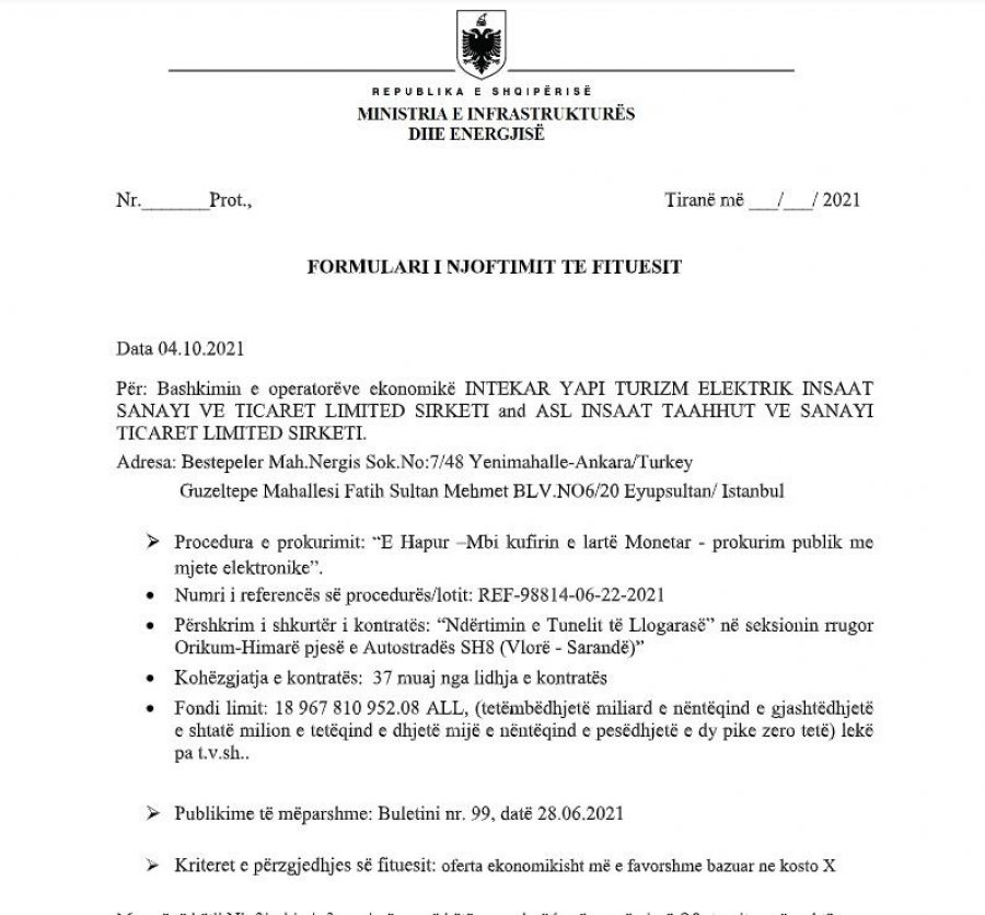 Procedura u rishpall për herë të dytë duke konkluduar me fituesin dhe kontratën e lidhur më 8 Nëntor 2021 me bashkimin e operatorëve përbërë nga dy kompani turke. INTEKAR YAPI TURIZM ELEKTRIK INSAAT SANAYI VE TICARET LIMITED SIRKETI and ASL INSAAT TAAHHUT VE SANAYI TICARET LIMITED SIRKETI me përfaqësues Abdulkadir Kart, ky i fundit ish-deputet në parlamentin turk dhe një mik i ngushtë i presidentit Erdogan.