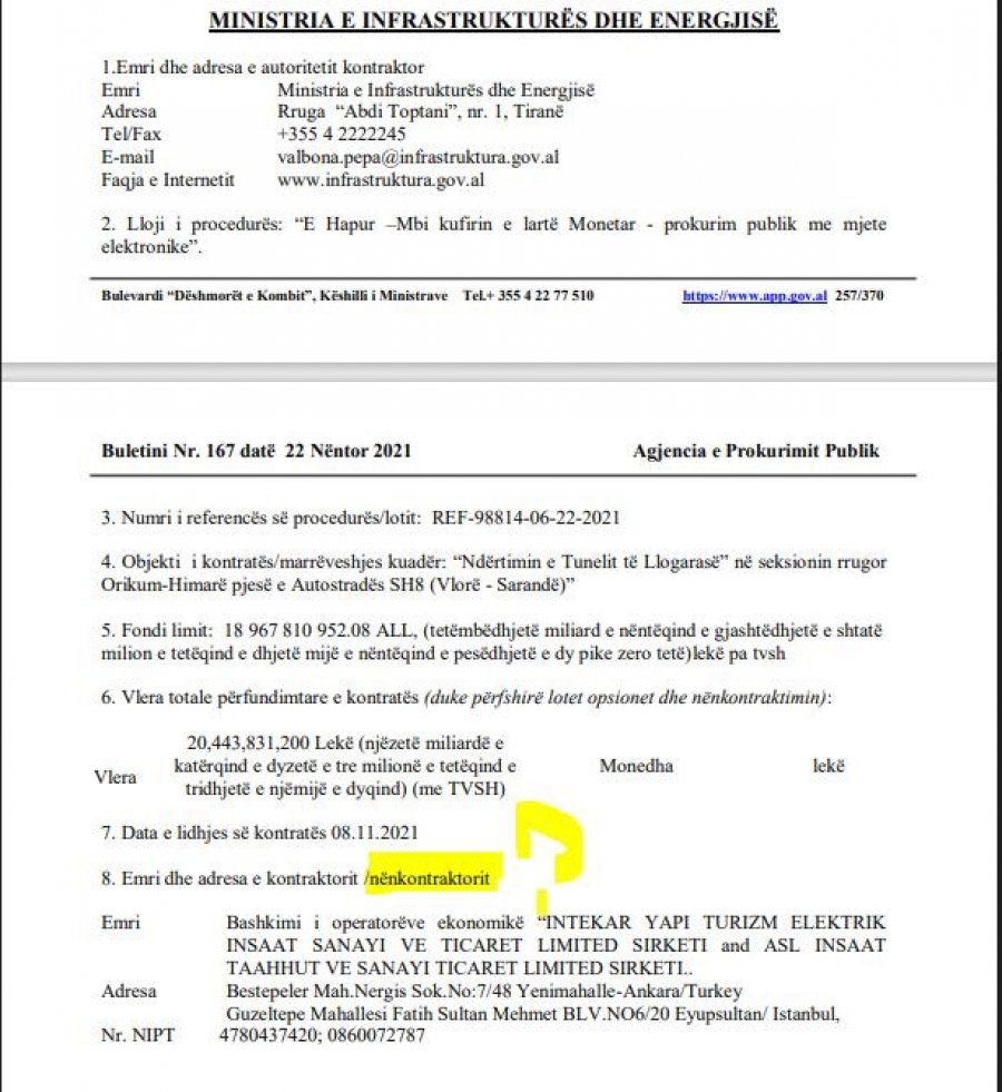 AK MIE në publikimin e njoftimit të kontratës së nënshkruar në buletinin nr. 167, datë 22 nëntor 2021, nuk ka plotësuar formatin sipas standardit të kërkuar dhe as ka njoftuar ndonjë nënkontraktor në këtë publikim as emër dhe as adresë por vetëm ka shënuar të dhënat e konsorciumit turk në cilësinë e kontraktorit.