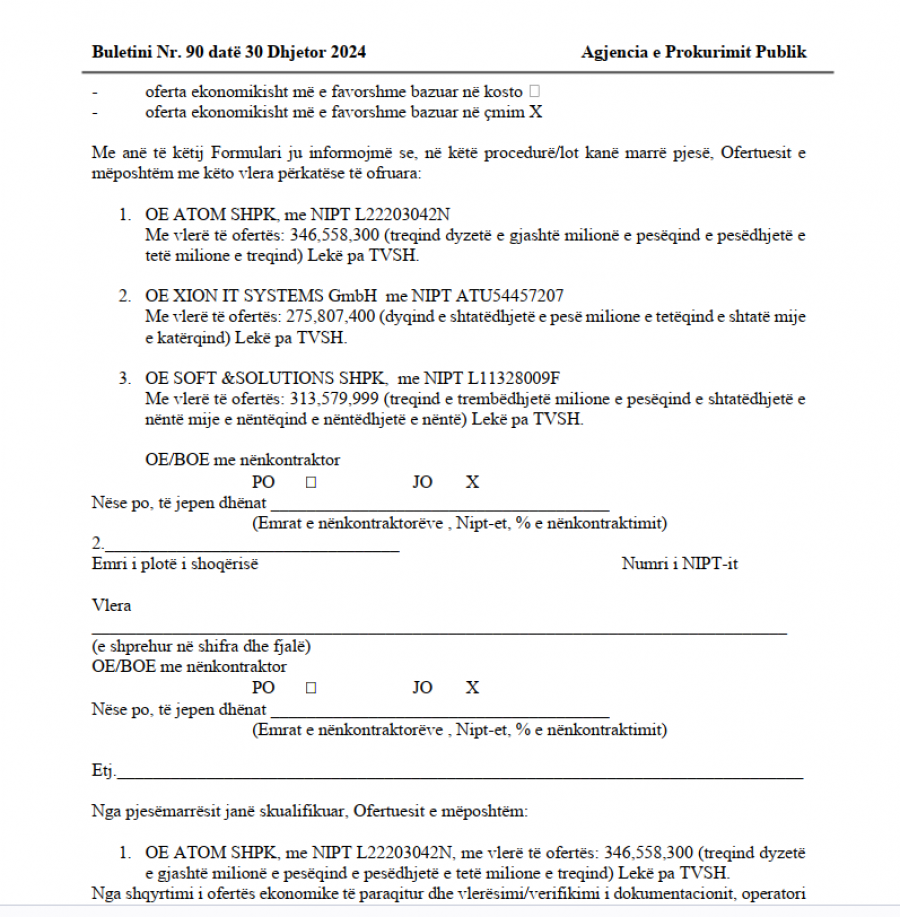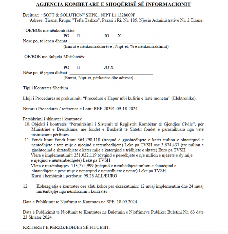 Në Tetor 2024 shpallet fituesi SOFT & Solution shpk në pronësi të Ermal Beqiraj me vlerë të ofertës 3.1 mil euro.