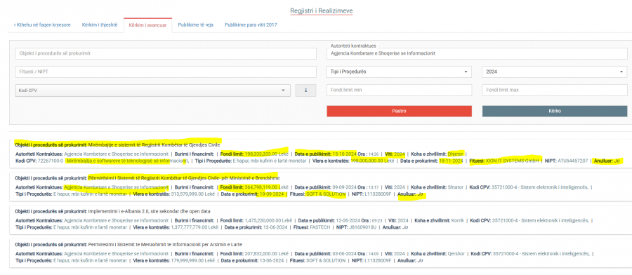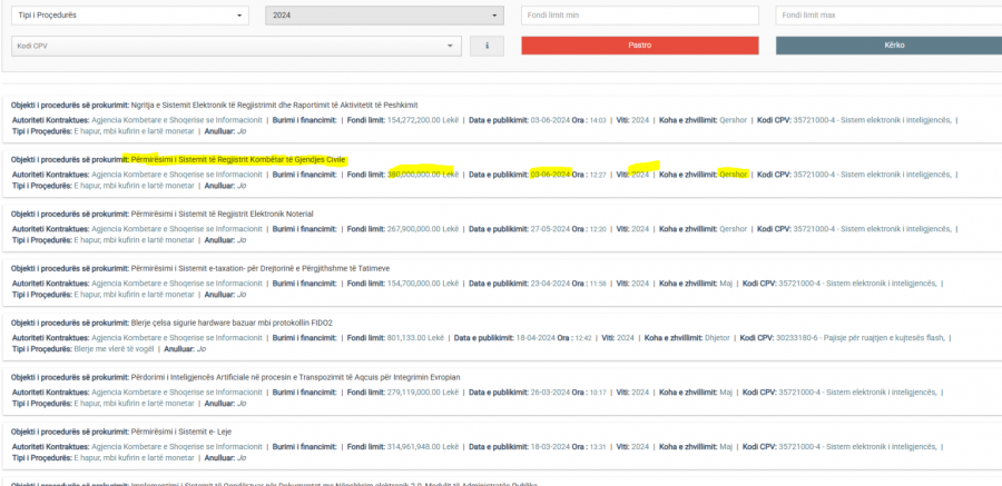 PD sqaron se “në Qershor të v. 2024 AKSHI shpalli procedurën e prokurimit me objekt: ‘Përmirësimi i Sistemit të Regjistrit Kombëtar të Gjendjes Civile’ me fond limit 3.8 mil euro e cila u anullua me arsyetimin se nuk u paraqit asnjë ofertë e përshtatshme.