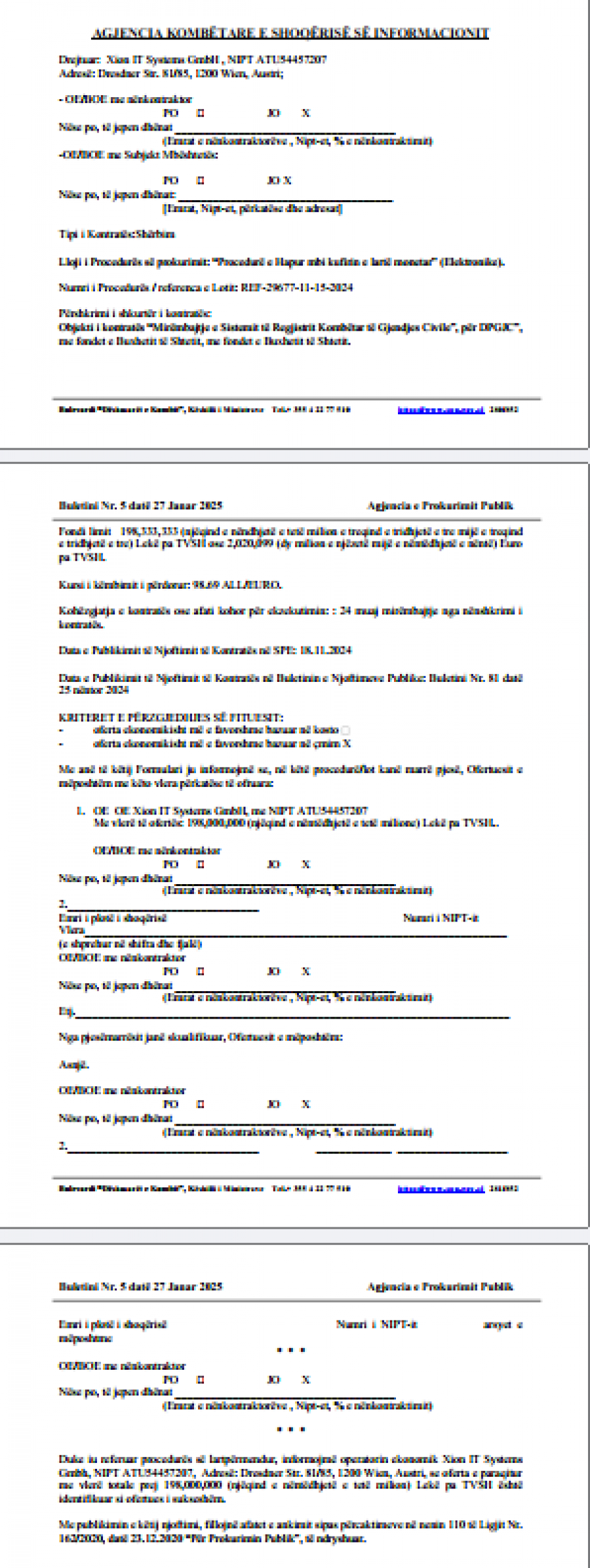 Sipas verifikimeve tona AKSHI Në vitet 2020, 2022, 2024 të njëjtën procedurë mirëmbajtjeje e ka prokuruar me fiks 1.9 mil euro dhe në të gjitha herët kontraktor ka qenë kompania austriake XION IT SYSTEMS GMBH”.
