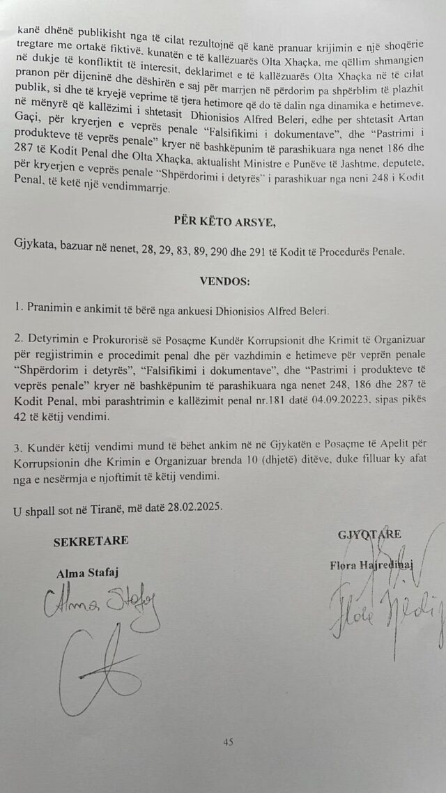 “Gjykata çmon se kallëzimi i shtetasit Alfred Beleri për shtetasit Artan Gaçi, për kryerjen e veprës penale ‘Falsifikimi i dokumenteve’ dhe ‘Pastrimi i produkteve të veprës penale’ kryer në bashkëpunim të parashikuar nga nenet 186 dhe 287 të Kodit Penal dhe Olta Xhaçka, aktualisht Ministre e Punëve të Jashtme, deputete, për kryerjen e veprës penale ‘Shpërdorimi i detyrës’ i parashikuar nga neni 248 i Kodit Penal, nuk ka një vendimmarrje, dhe se ankimi i paraqitur nga shtetasi Dhionisis Alfred Beleri, për këtë pjesë të kallëzimit, është i bazuar në ligj.