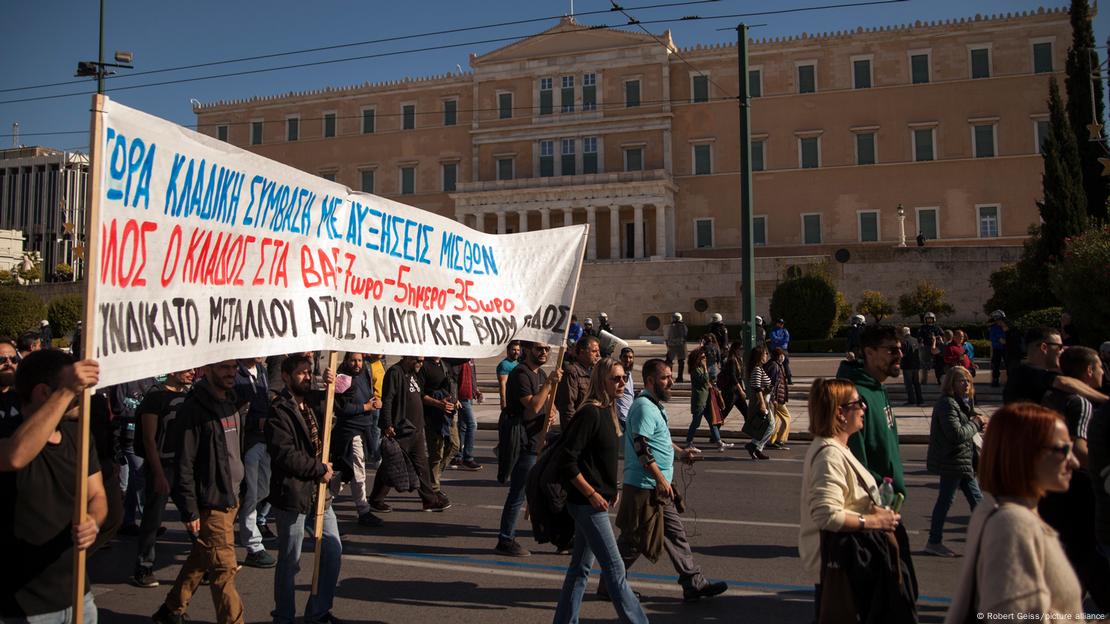 Protesta para grevës më 1 tetor – Në Greqi njerëzit nuk mund të jetojnë më të ardhurat nga 40 orë punë në javë, ndaj ata bëjnë orë shtesë pune, ose gjejnë një punë të dytëFotografi: Robert Geiss/picture alliance