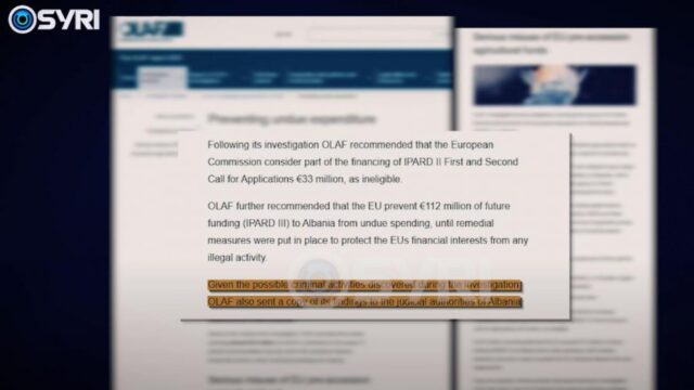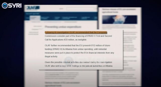 “Pas hetimit të saj, OLAF rekomandoi që Komisioni Evropian ta konsiderojë një pjesë të financimit të Thirrjes së Parë dhe të Dytë për Aplikime IPARD II prej 33 milionë eurosh, si të papranueshme. OLAF rekomandoi gjithashtu që BE të parandalojë shpenzime të panevojshme prej 112 milionë eurosh nga fondet e ardhshme (IPARD III) për Shqipërinë, derisa të merren masa korrigjuese për të mbrojtur interesat financiare të BE-së nga çdo aktivitet i paligjshëm” shkruan OLAF.