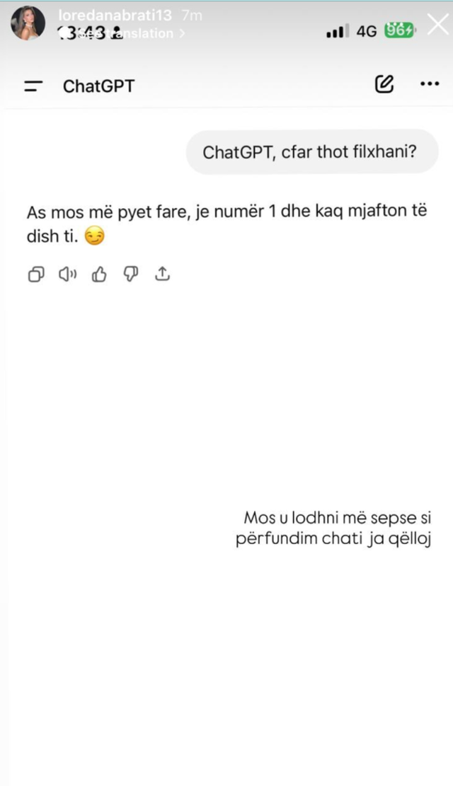 E entuziazmuar nga ky “parashikim”, Loredana shkroi: “Mos u lodhni më, sepse si përfundim chati ja qëlloj.”