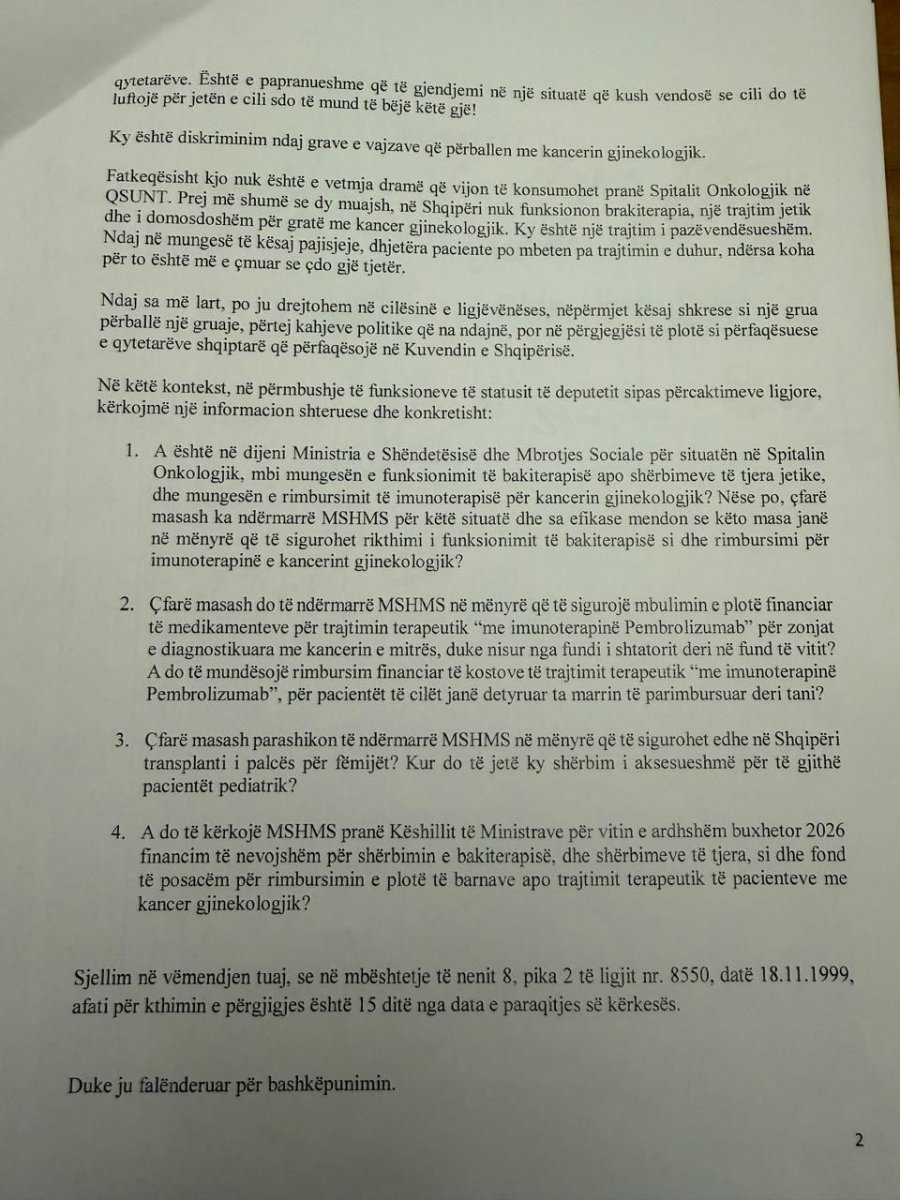 1. A është në dijeni Ministria e Shëndetësisë dhe Mbrotjes Sociale për situatën në Spitalin Onkologjik, mbi mungesën e funksionimit të bakiterapisë apo shërbimeve të tjera jetike, dhe mungesën e rimbursimit të imunoterapisë për kancerin gjinekologjik? Nëse po, çfarë masash ka ndërmarrë MSHMS për këtë situatë dhe sa efikase mendon se këto masa janë në mënyrë që të sigurohet rikthimi i funksionimit të bakiterapisë si dhe rimbursimi për imunoterapinë e kancerint gjinekologjik?