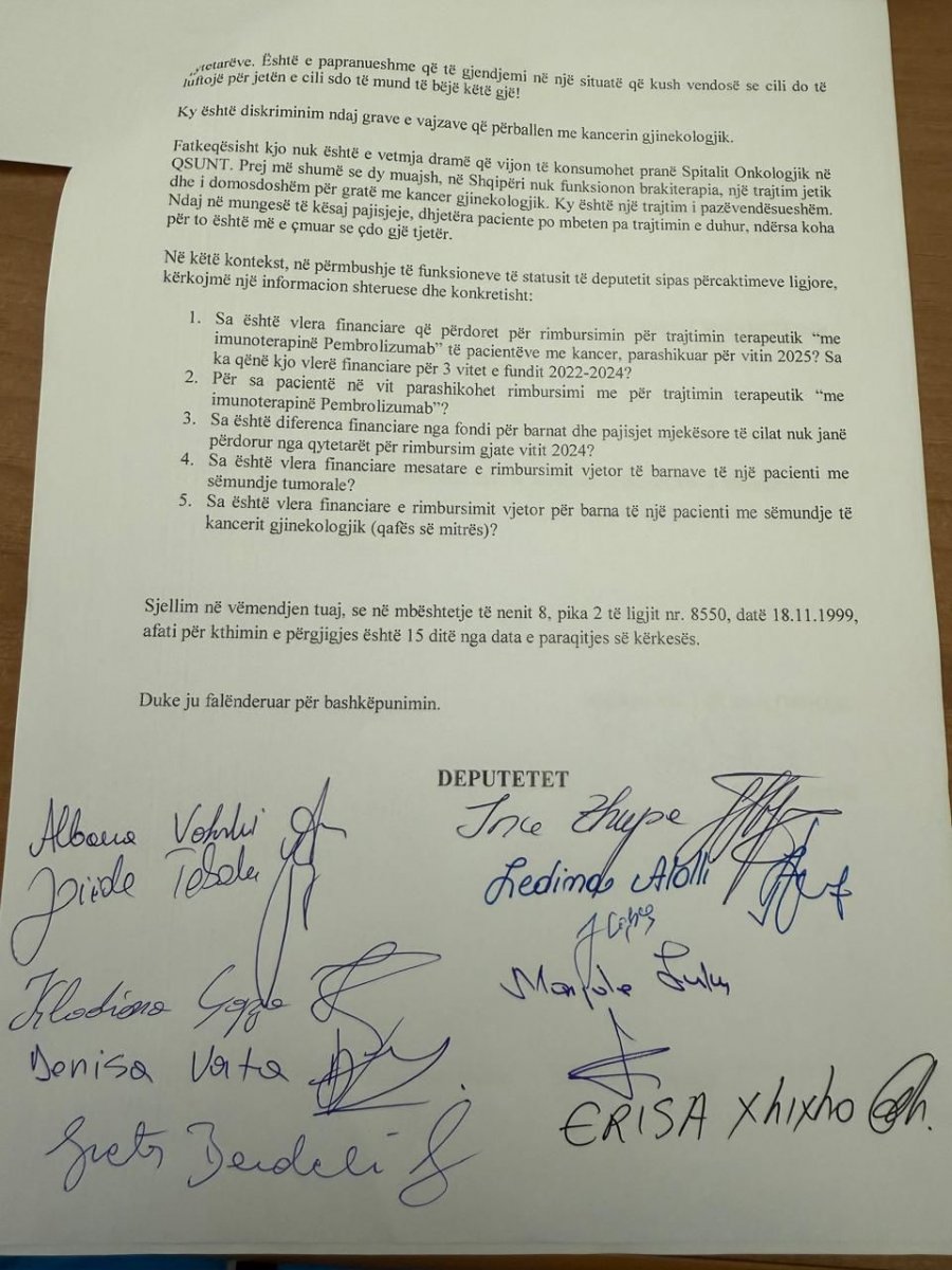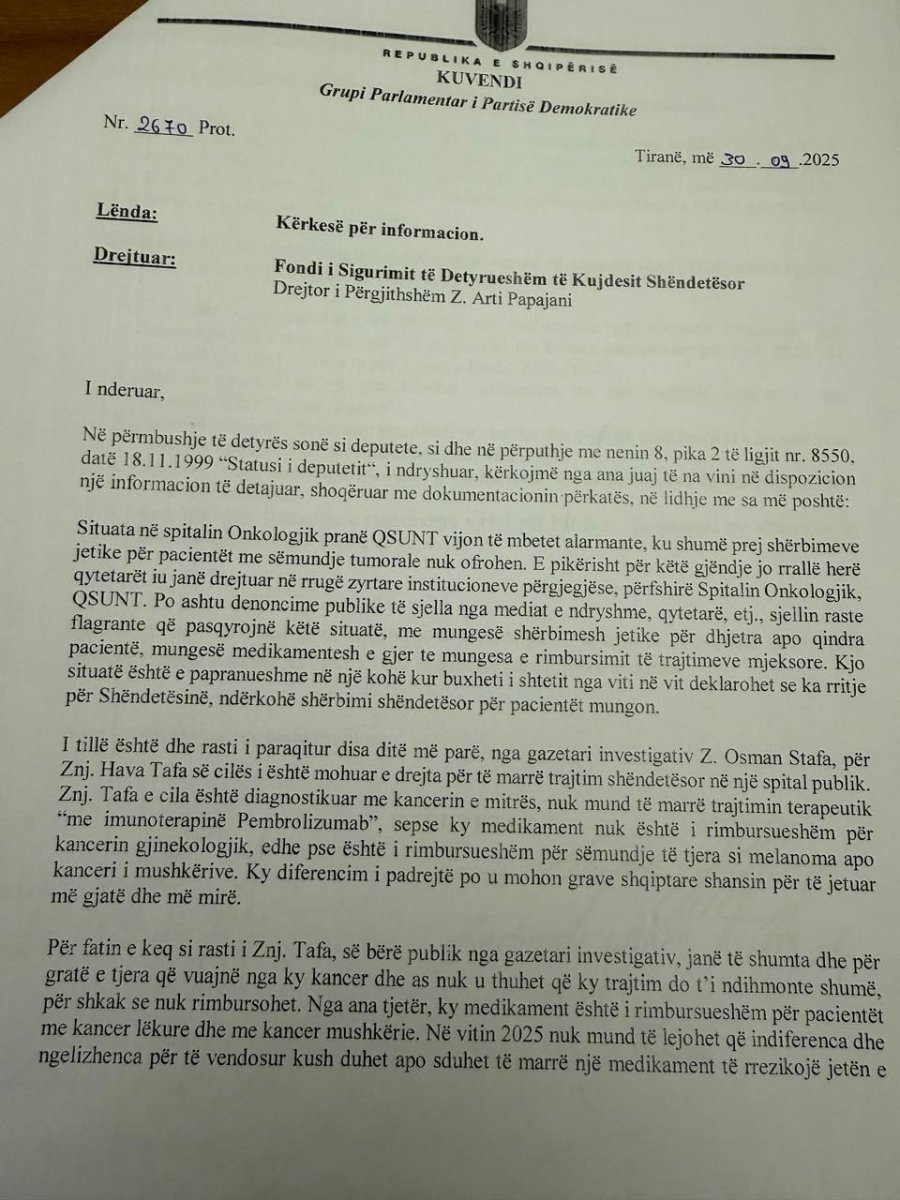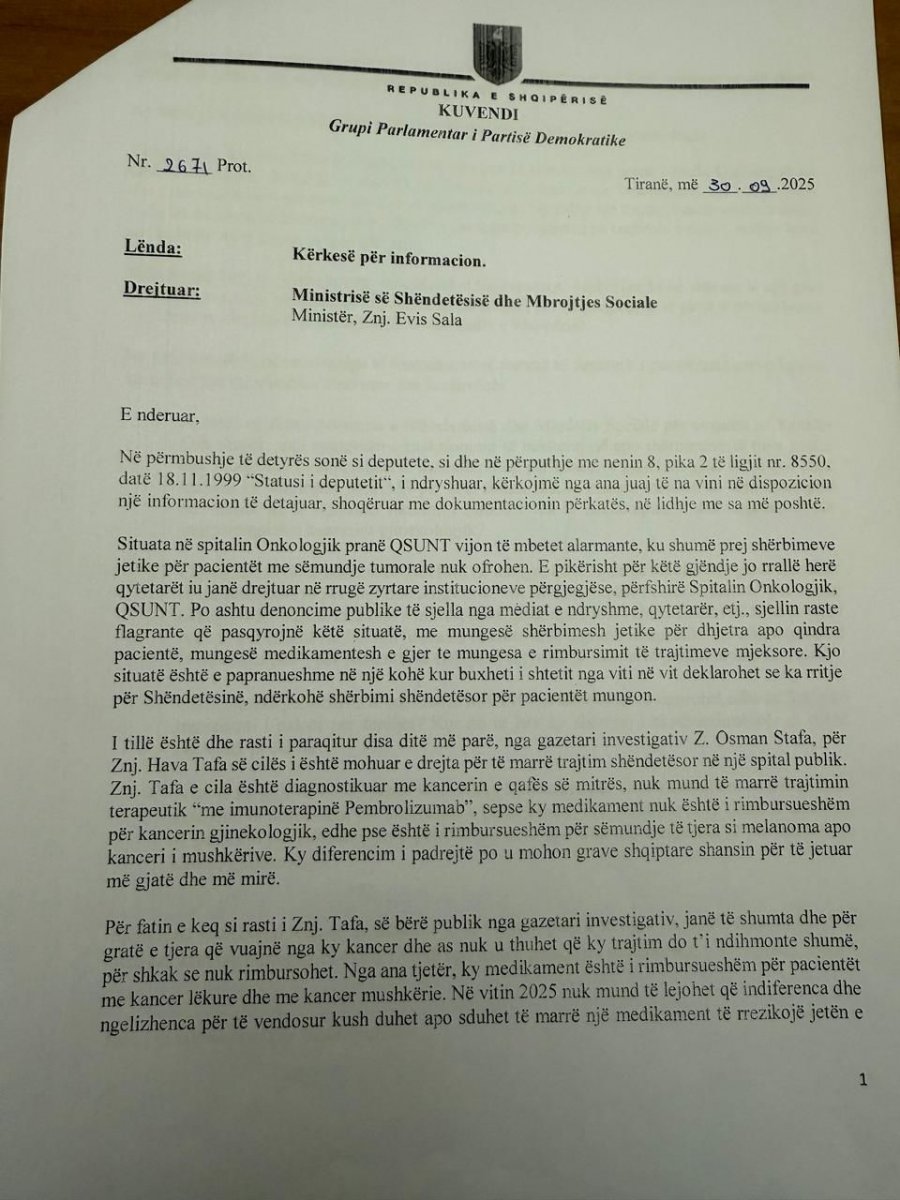Përmes një shkresë të firmosur nga deputetet e PD, teksa e kanë cilësuar kriminale, mungesën e medikamenteve në këtë spital, ato kërkojnë që t’u jepet informacion nga ana e Ministrisë së Shëndetësisë dhe FSDKSH për situatë.