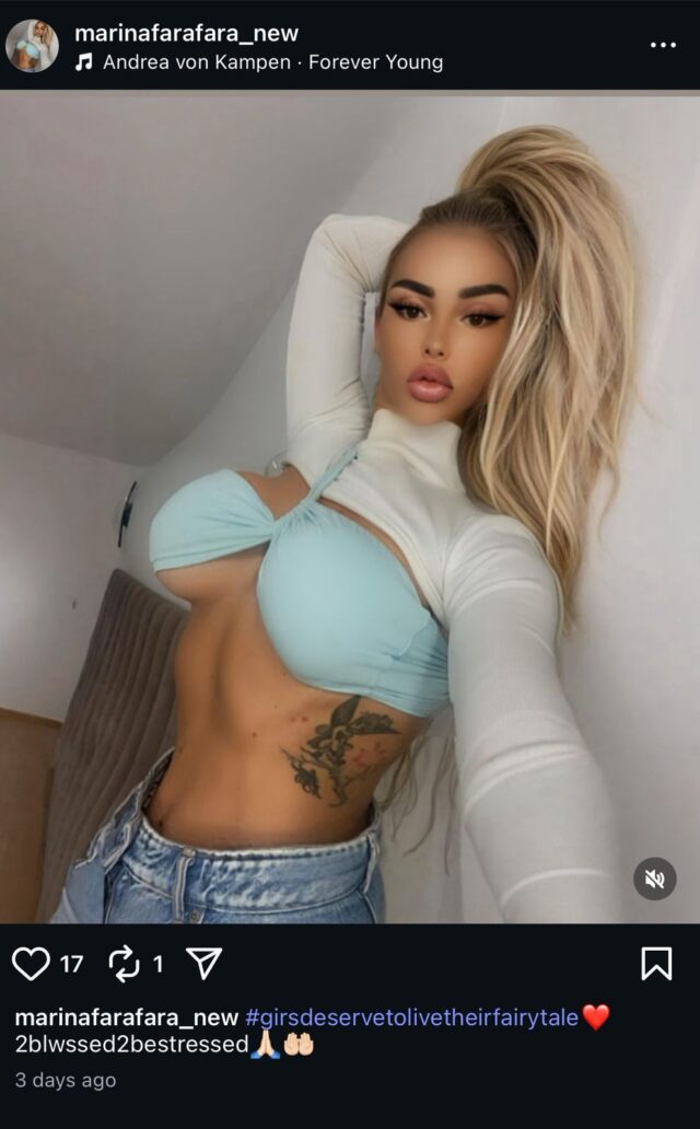 Pas kësaj periudhe, Marina ka rifilluar aktivitetin në Instagram, ku ka publikuar disa foto provokuese, duke tërhequr vëmendjen e ndjekësve të saj. Një prej fotove e shoqëron edhe me një mesazh: “Vajzat meritojnë të jetojnë përrallën e tyre”.