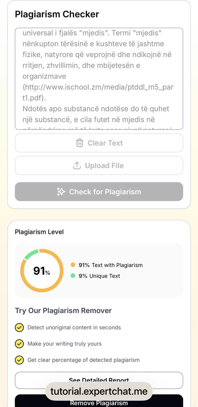 Por për t’u bindur ia dorëzova konkluzionin një faqeje të posacme që identifikon shkallën e plagjiaturës (Plagiarism checker).