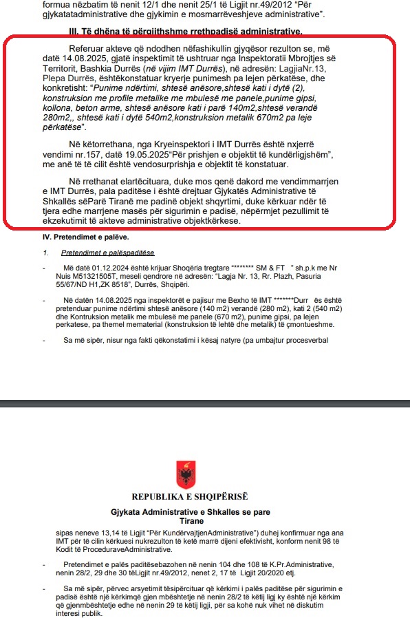 Në kuadër të hetimit paraprak, është administruar në cilësinë e provës dokumentare “akti i konstatimit” nr.9, datë 14.08.2025 i Inspektoratit të Mbrojtjes së Territorit pranë Bashkisë Durrës.