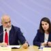 BRUSSELS, BELGIUM - NOVEMBER 15: Albanian National Flag and European Union flag are seen as High Representative of the European Union (EU) for Foreign Affairs and Security Policy and Vice-President of the European Council Federica Mogherini (not seen) and Albanian Foreign Minister Ditmir Bushati (not seen) attend a meeting of EU - Albania Stabilisation and Association Council in Brussels, Belgium on November 15, 2017. (Photo by Dursun Aydemir/Anadolu Agency/Getty Images)