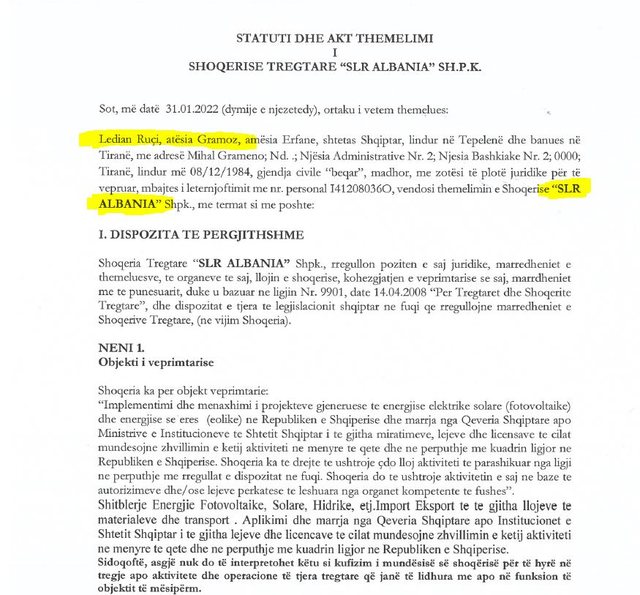 Faksimile: Statuti dhe akti i themelit të kompanisë SLR Albania, me pronar z. Ledian Ruçin, djalin e ish-kryetarit të Kuvendit Gramoz Ruçi