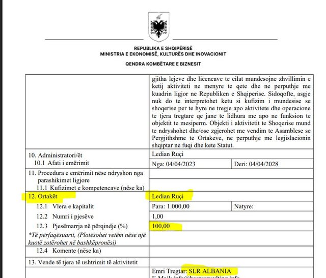 VoxNews shfletoi edhe të dhëna nga Qendra Kombëtare e Biznesit, ku rezulton se firma SLR ALbania ka si pronar me 100 % të aksioneve z. Ledian Ruçi. Një emër i njohur, edhe në të kaluarën në disa çështje të hapura në Tiranë apo edhe nga kronika rozë.
