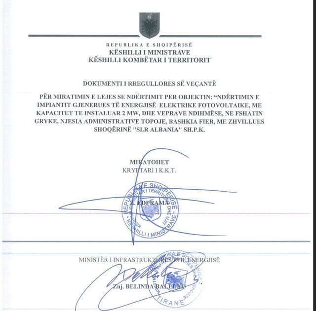 Sipas dokumenteve që ka siguruar VoxNews, ditët e fundit Këshilli Kombëtar i Territorit dhe Ujit ka zbardhur një nga lejet më kontroverse, atë të “miratimit të lejes se ndërtimit për objektin ‘ndërtimin e impiantit gjenerues të energjisë elektrike fotovoltaike, me kapacitet të instaluar 2 më, dhe veprave ndihmëse, ne fshatin grykë, Njësia Administrative Topojë’”. Mësohet se subjekti zhvilluar do të jetë shoqëria “SLR Albania” sh.p.k.